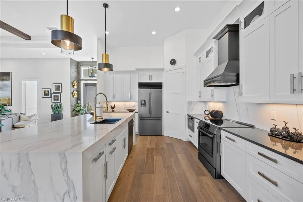 “”BRAND ‘NEW CONSTRUCTION”, COMPLETED late 2024/Beginning of 2025.”WATER FRONT,” LONG WATER VEIWS,”GORGEOUS”MOVE-IN READY” NOW”!!!!OWN A PIECE OF THE GOLD-COAST,HUGE FABULOUS LOT”EXTRA GREAT VALUE”, NO WAITING TO BUILD”!!!,QUICK and Direct Access, no bridges, Open water, COASTAL CHIC FLARE ‘CASUAL- sophisticated, comfort”(New LUXURY Designer, Furnished, from all high- End Stores’ ‘BONUS NEGOTIABLE ,” EXTRA Large Lot, room for YOUR Boat, RV, Pickle ball court,play ground etc.”NEW- Dock installed IMPERIAL DOCK with fish station, water and electric!!! 3 car garage over sized, LOTS OF new ,STORAGE selves added, electric CAR plug in, ”’Beautifully, appointed wood floors”’,10 inch base ,designer kitchen, Bosch appliances, 4-inch Quartz center Ialand,2 water- falls, Cabinets-under lighting and Above, latest in colors,,brick walls , with,2-modern electric fireplaces, in primary bedroom and great room,wooden beams in great room,designer- lighting throughout,’12 foot sliding glass doors” spa like IN PRIMARY bath”, Large walk-in closet in PRIMARY BEDROOM.””GREAT 2nd floor’,2 large bedrooms +Great seating in TV area for guests, open air Laini and private bath ..Large POOL and SPA Included outdoor kitchen for your fresh catch of the day AND extra outdoor patio in yard + grill.” !!!HURRICANE READY, IMPACT WINDOWS AND DOORS.walk to shopping and dining, close to private MARCO Beach PRIVATE – members only, with restaurant included, short bike ride …location location,”EZ show”!!!MUST SEE PHOTOS