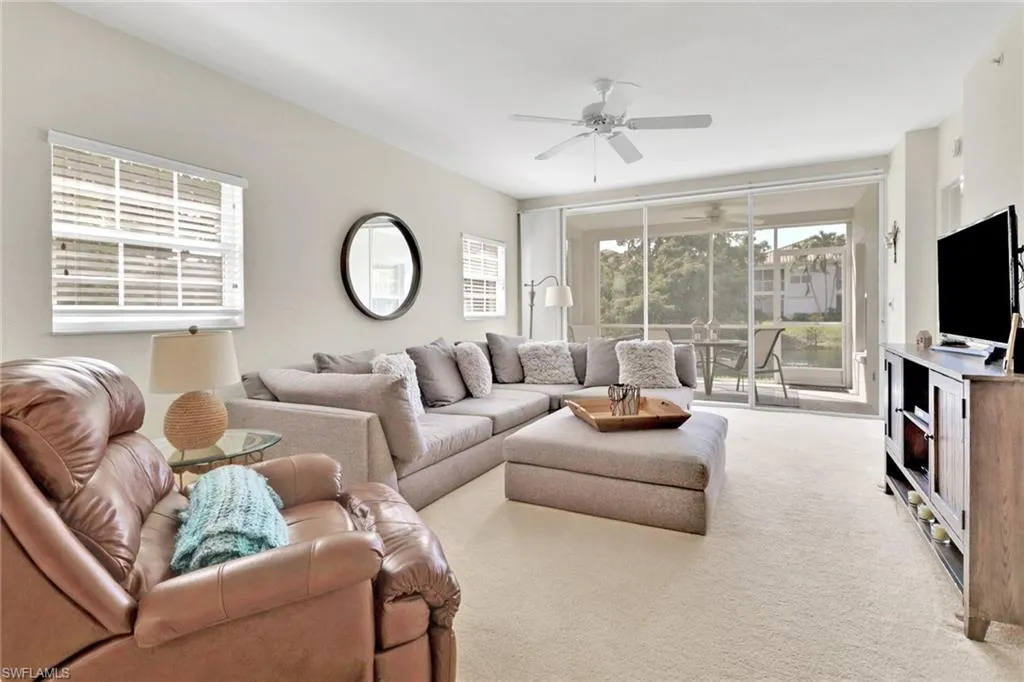 Welcome to Calusa Bay North! This light and bright first-floor lakefront villa offers the perfect blend of comfort, convenience, and Florida charm. Turnkey furnished and ready for immediate enjoyment, this spacious residence features 2 bedrooms plus a den and 2 full baths, with a thoughtfully designed layout ideal for both everyday living and entertaining. The open-concept living and dining area flows seamlessly to the screened lanai, where you can relax and enjoy tranquil lake views. The eat-in kitchen includes a breakfast bar and ample cabinet space, while large windows throughout fill the home with abundant natural light. You’ll appreciate the spacious bedrooms, carpet throughout, and plenty of room for guests. A single-car garage adds convenience and extra storage.