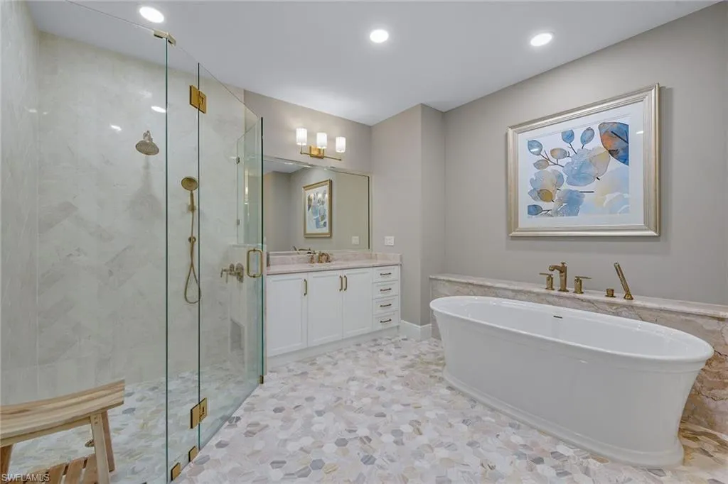 Experience refined coastal living in this beautifully renovated first-floor residence, perfectly positioned to capture tranquil lake and golf course views within the coveted Montreux enclave of Fiddler’s Creek. Designed with elegance and livability in mind, this spacious three-bedroom, three-bath home lives like a single-family residence, offering a private entrance, attached two-car garage, and an open, light-filled layout. The gourmet kitchen impresses with quartzite countertops and backsplash, white cabinetry, stainless steel appliances, and a charming breakfast nook overlooking lush tropical gardens. Each of the three bathrooms has been completely renovated, showcasing elegant finishes, modern tilework, and spa-like details throughout. The serene owner’s suite opens to the lanai and features dual walk-in closets and a beautifully updated bath with a soaking tub and frameless glass shower. Additional enhancements include a freshly painted interior, designer lighting, and a brand-new HVAC system, creating a move-in-ready retreat that blends comfort and modern sophistication. A screened lanai provides the ideal setting for morning coffee or evening gatherings, framed by sweeping water and golf vistas. Montreux is currently undergoing a community-wide landscaping enhancement, further elevating the neighborhood’s beauty and appeal. Residents enjoy access to the award-winning Fiddler’s Creek Club & Spa, offering fine and casual dining, resort-style pools, a full-service fitness center, spa, tennis, pickleball, and an active social calendar. Optional golf, beach, and marina memberships further enhance the unparalleled Florida lifestyle this residence affords.