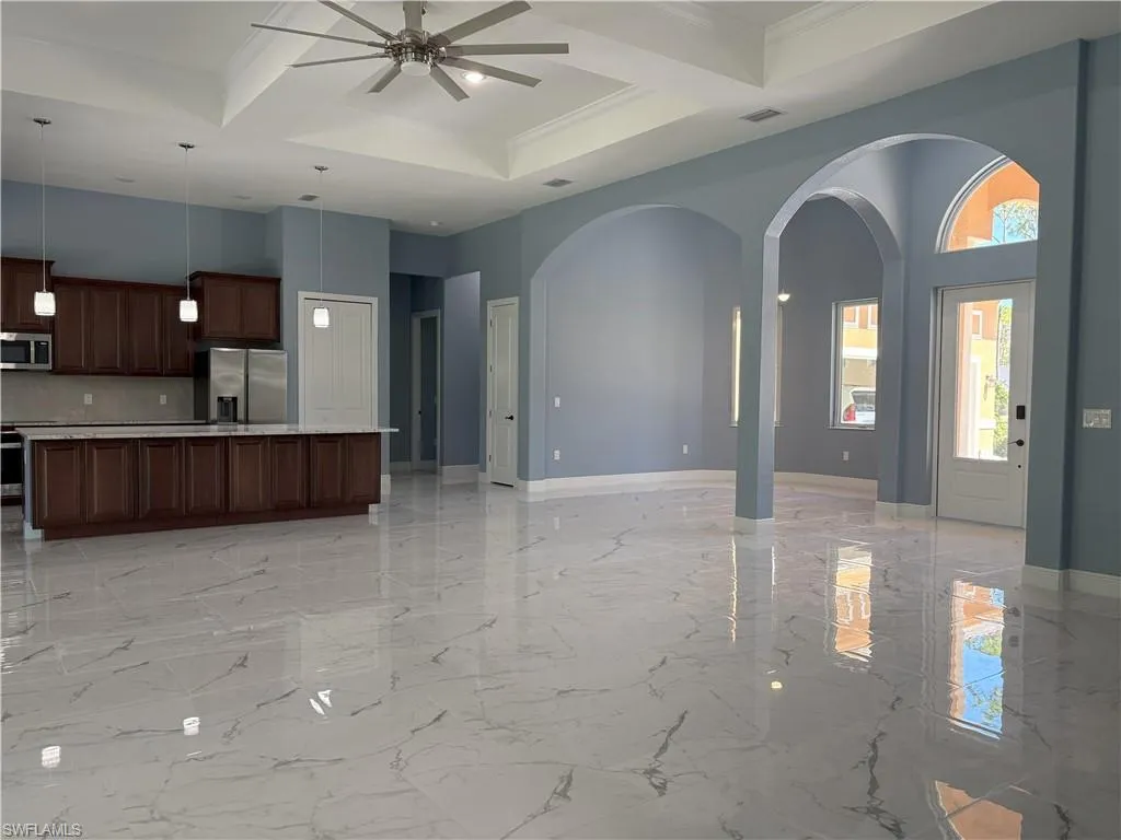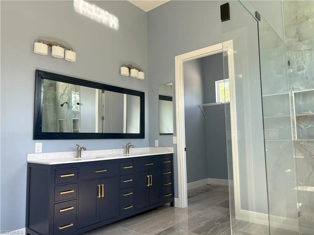 Welcome to this spectacular custom-built home located in one of the most desirable neighborhoods in Bonita Springs. This spacious and airy 2024 residence features 12-foot ceilings throughout, with soaring 14-foot ceilings in the foyer, dining room, great room, and den/bedroom—all beautifully accented with crown molding. The luxurious primary suite showcases oversized porcelain tile flooring, an 84-inch dual-sink vanity, and a large spa-style frameless shower. The generous layout also allows space for a cozy sitting area. The expansive kitchen is ideal for entertaining, offering a massive island and abundant cabinetry for storage. The guest bedrooms are spacious and inviting, including one with an en suite bath that conveniently opens to the lanai for easy outdoor access. Additional features include impact-resistant double pane casement windows, an energy-efficient tankless water heater, a smart cooktop, extensive lanai and more. The property is connected to central water and also includes a well system for irrigation with automatic sprinklers. San Carlos Estates offers a tranquil and idyllic setting in the heart of Bonita Springs with no HOA and Flood Zone X —just minutes from Coconut Point, Barefoot Beach, shopping, and fine dining.