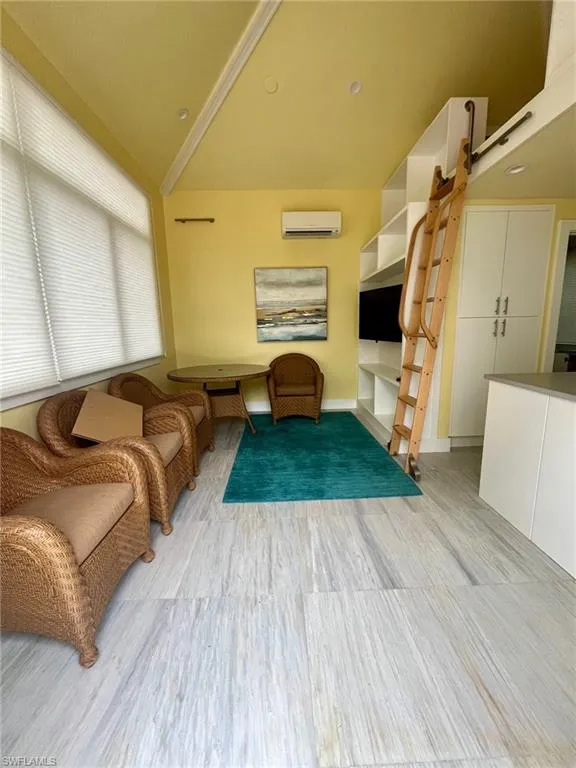 This coachhouse was built in 2016 and is 304 square feet of interior space. The floor plan includes a full modern white kitchen with bar countertop, bathroom with stand-alone shower, toilet, and vanity, living area with built in shelving and entertainment area, and a loft. There is full width window enabling the view of the lake from all areas of the coachhouse.
