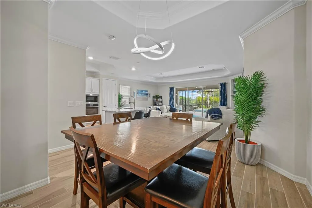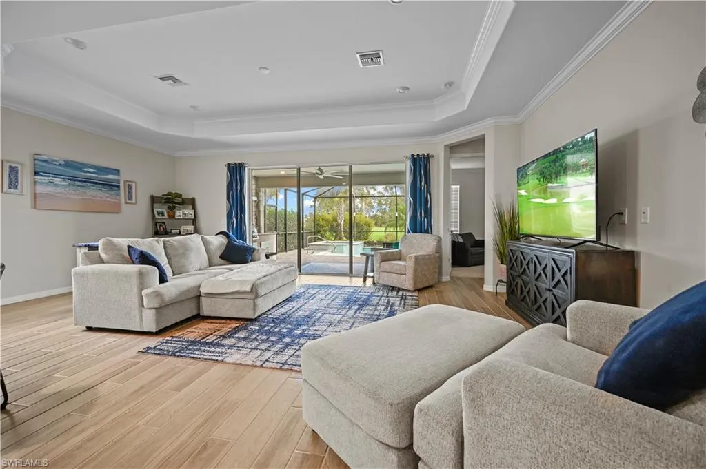 Enjoy Florida living at its best on the screened lanai, featuring a custom outdoor kitchen, sparkling pool, and panoramic golf course views. Whether hosting gatherings or unwinding, this outdoor oasis delivers the perfect balance of relaxation and sophistication.