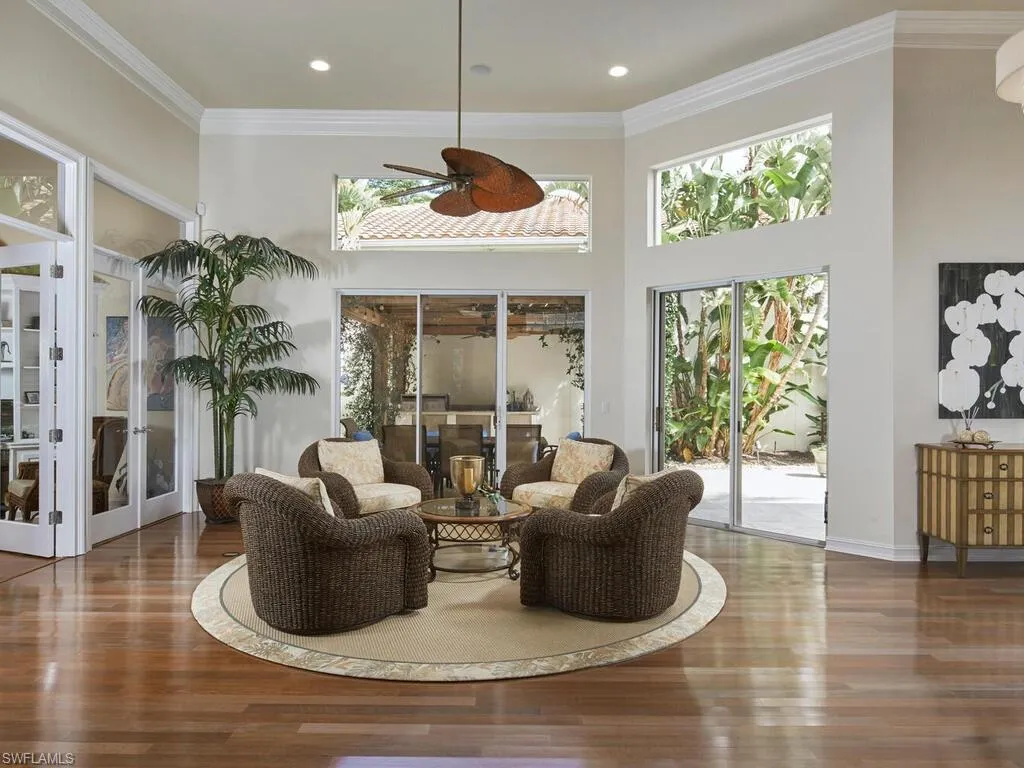 Tucked within the exclusive gates of Grand Isle at Pelican Marsh, this luxury courtyard home blends elegance, privacy, and resort-style living in the heart of Naples. The main residence offers two spacious bedrooms plus a den and two and a half baths, showcasing rich dark wood floors that add warmth and sophistication throughout. Across the tranquil courtyard, a private guest casita provides an additional bedroom and full bath, ideal for visitors or a home office retreat.
