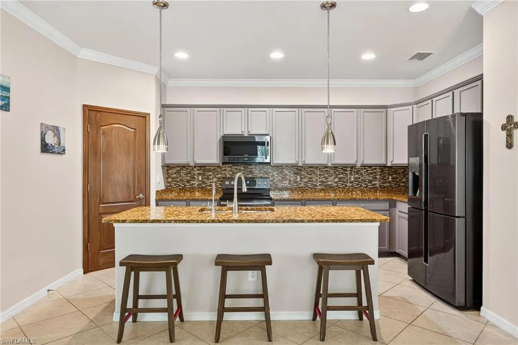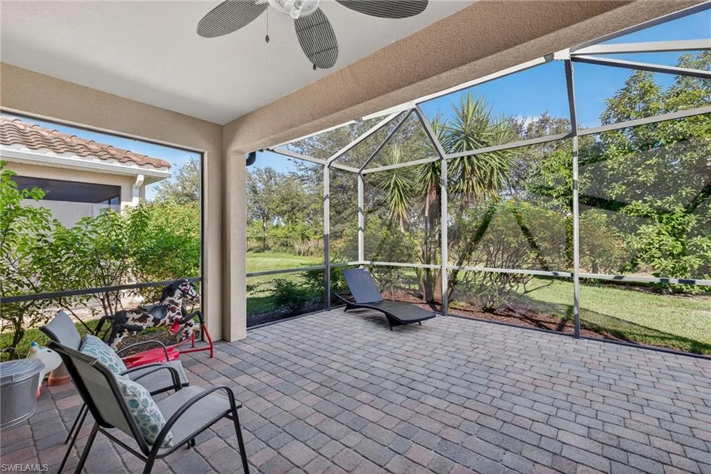 Welcome Home to Orange Blossom Ranch! Discover your dream home in Orange Blossom Ranch— one of Naples’ most desirable gated communities, offering low HOA fees, resort-style amenities, and a vibrant family-friendly lifestyle. This meticulously maintained 4-bedroom, 3-bath single-family home (popular Trevi model by Lennar) is privately located on the edge of the community and sits on a wide freshwater canal with desirable eastern rear exposure- perfect for enjoying peaceful sunrises from your lanai. Offering over 2,000 sq. ft. of open-concept living designed for both comfort and elegance. The bright, spacious layout features soaring ceilings, crown molding, and easy-to-maintain tile flooring throughout the main living areas. The gourmet kitchen showcases stainless steel appliances, granite countertops, a large center island, and a generous size pantry—perfect for cooking, entertaining, or gathering with family. The open great room and dining area flow seamlessly to the extended screened lanai, creating a perfect indoor-outdoor lifestyle. Enjoy tranquil views as you relax or entertain in your private outdoor retreat surrounded by lush landscaping, including two mango trees, an avocado tree, and a lemon tree. The primary suite offers two walk-in closets and a spa-inspired en-suite bath with dual sinks, large soaking tub, and a walk-in shower. A private guest bedroom with its own full bath provides comfort and privacy, while two additional bedrooms share the 3rd full bathroom—making this home ideal for families or guests. Additional features include hurricane shutters, a Vivint smart home security system, laundry room with stackable washer and dryer, and a 2-car garage. The brick paver driveway and entryway complete the home’s beautiful curb appeal. You won’t find another Trevi model with a lanai this spacious! This exceptional enclosed outdoor retreat offers the perfect blend of elegance and comfort- ideal for hosting family gatherings, entertaining friends, or simply relaxing under the Florida sun. Residents of Orange Blossom Ranch enjoy two resort-style heated pools and spas, clubhouse, fitness center, tennis, pickleball, basketball, volleyball, bocce courts, fishing pier, playground, and miles of walking trails. The community hosts year-round social events- from food truck nights to game nights- making it easy to meet neighbors and enjoy a true sense of community. Conveniently located near top rated schools, Ave Maria University, and the brand-new Publix Plaza (featuring Starbucks, Tropical Smoothie, 5/3 Bank, and more). You’re also just minutes from Big Corkscrew Island Regional Park, offering miles of trails, sports fields, splash pads, and nature adventures. Low HOA fees include lawn care, irrigation, and full access to all amenities. The community is pet-friendly and not in a flood zone—no flood insurance required. With its unbeatable combination of location and amenities, this move-in-ready home perfectly embodies Naples living at its finest!