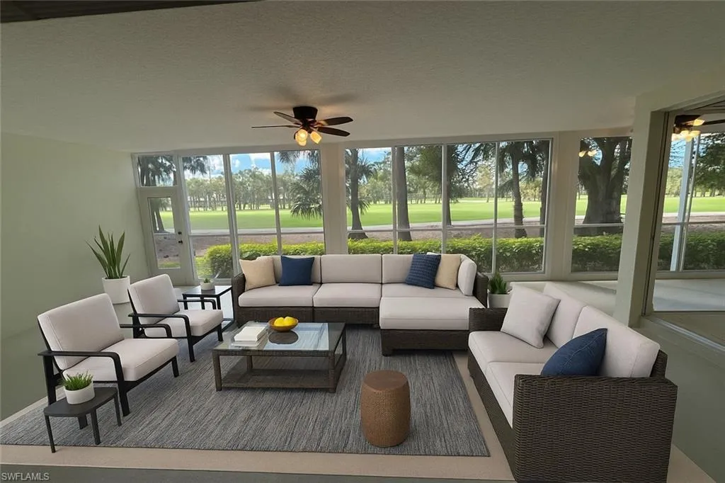 IMMEDIATE EQUITY GOLF MEMBERSHIP with This unfurnished 2-bedroom, 2-bath condominium with a 1-car garage offers a rare opportunity to create your dream home in the prestigious Eagle Creek Golf and Country Club. While the home requires some renovation, it boasts a spacious layout and an oversized lanai with stunning views of the golf course—perfect for enjoying tranquil mornings or evening sunsets. Located in a small, private club with just 370 golf members, immediate golf access is available with no waitlist. The community also features world-class amenities including golf, tennis, pickleball, multiple dining venues, and a vibrant social calendar. Ideally situated just 8 miles from the upscale dining and shopping of Naples’ 5th Avenue and the beautiful beaches and nightlife of Marco Island, this property combines the best of coastal living with the charm of a close-knit country club environment. (LANAI HURRICANE IMPACT SLIDERS ARE SCHEDULED TO BE INSTALLED)