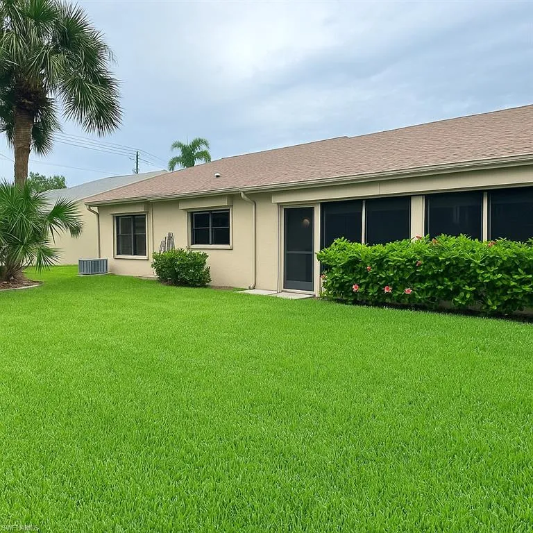 Enjoy tranquil mornings or sunset evenings in the screened-in lanai overlooking lush greenery and flowering hedges for privacy. The backyard opens up to a pristine lake, framed by tropical landscaping and swaying palms—offering the perfect backdrop for peaceful living or entertaining friends and family.