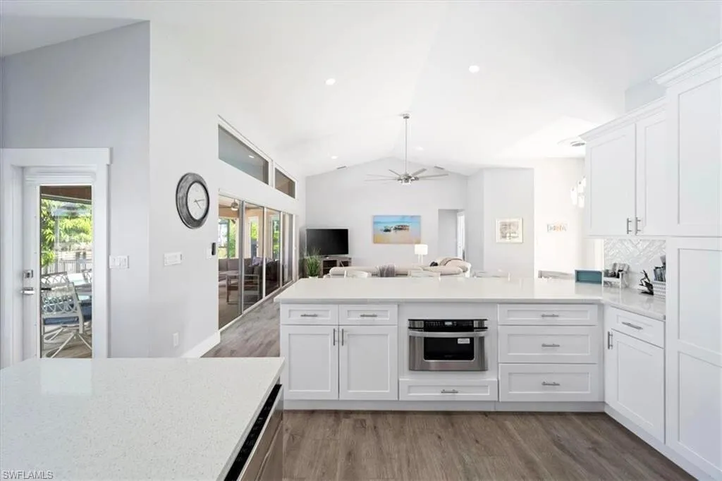 Inside, the open-concept design showcases a beautifully updated kitchen with high-end appliances, quartz counters, and custom cabinetry. Fresh paint, luxury vinyl plank flooring, and refined trim details enhance the home’s elegant coastal style. Expansive pocketing sliding glass doors in the living area open fully to the lanai, creating a seamless flow between indoor and outdoor living spaces.