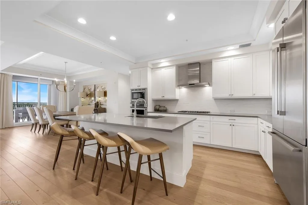 Welcome to this STUNNING Seaglass home at Bonita Bay! Home was originally a MODEL unit offering so many GORGEOUS upgrades. Upon entering, you will be captivated by the open and airy space, tall ceilings, attention to detail and the stunning golf course AND Estero Bay Views! This tastefully decorated FULLY FURNISHED home will surely keep your attention. Located on the 4th floor, with 3 bedrooms and 3 and a half baths, this home is so very spacious, with a large lanai to the west and an open balcony to the east. The views from the great room and primary suite feature breath-taking year-round sunsets. Keep your doors open all winter while preparing meals in your gourmet kitchen featuring BRAND NEW Thermador appliances, gas cooktop and quartz countertops. Enjoy dinner in the dining area, at the large kitchen island or on the large lanai where you will find a gas grill. Morning coffee or evening cocktail on the lanai? Either beverage is the perfect accompaniment to the views! The primary suite is located on the western side of the home and two additional bedrooms with ensuite bathrooms are tucked away on the eastern side of the home. You and your guests will love the privacy this floorplan provides. There is a private elevator lobby just outside the front door. Upgrades include wood flooring throughout the main living areas, brand new AC unit, brand new carpeting in guest suites, brand new 80-gallon water heater, brand new leak detection system throughout, hurricane shutters on lanai an SO MUCH MORE! You DO NOT want to miss your opportunity to see this Bonita Bay home! The building amenities include a luxurious lobby, a fitness center, a theatre, stunning resort style pool & more! Spend the day at the Beach Club, playing tennis or golf, or just lounging at the pool. With a year-round sea breeze, you will never want to “head north” again! The perfect home, located in the perfect community. Bonita Bay offers an array of exceptional amenities, including a private beach club, kayaking, canoeing, pickleball, tennis, and multiple community parks. Explore over 12 miles of walking and biking paths or take advantage of the full-service marina and restaurant. Golf enthusiasts will appreciate the FIVE on-site courses, several dining options, a state-of-the-art fitness center, and more–all available with club membership (additional fees apply). Located just a short drive from world-class dining, shopping, beaches, and nature preserves, you’ll also enjoy easy access to the burgeoning downtown Bonita Springs and downtown Naples. RSW International Airport is conveniently nearby!