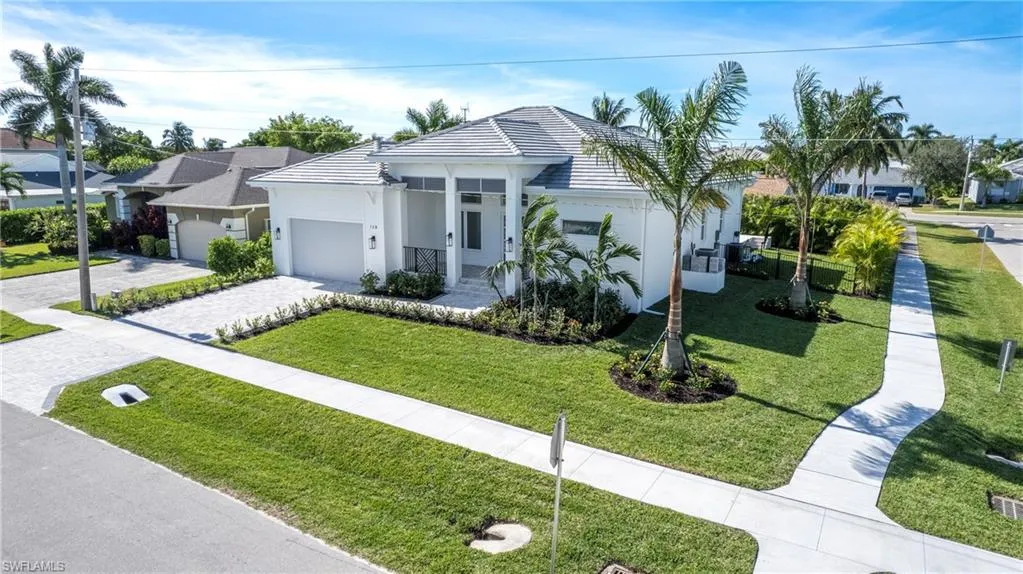 Just Completed Brand New Construction! This luxury home is situated perfectly on an oversized corner lot with western exposure and incorporates an open concept including 4 bedrooms, 3 full bathrooms, large great room, kitchen and dining area overlooking the saltwater pool and spa, pool bath, outdoor kitchen with grill, vent hood, beverage fridge, and sink, and 2-car garage with an epoxy floor. The inviting, airy design has white kitchen cabinets, quartz countertops, large gray island with waterfall countertop, upgraded GE Cafe appliances, and tile flooring throughout. The Owner’s Suite has two custom, walk-in closets, separate vanities, huge double-entry tile shower, soaking tub, walk-in linen closet, and private water closet. This home boasts high ceilings, 10’ tall sliders throughout, large impact windows, and covered lanai. The many upgrades include custom closets in all 4 bedrooms, upper kitchen cabinets and cabinets on both sides of the island, beautiful fans and lighting, cased windows and doors, tray ceilings with shiplap, foam insulation, shellstone on the lanai, tropical landscaping, and much more. This incredible beach house is centrally located and is just minutes to the white sand beaches of Marco Island, parks, tennis and pickle ball courts, golf, shopping, dining, schools, and the YMCA. Welcome to paradise!