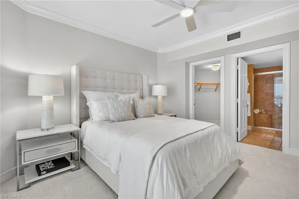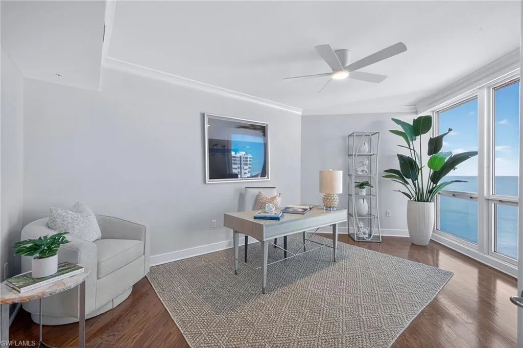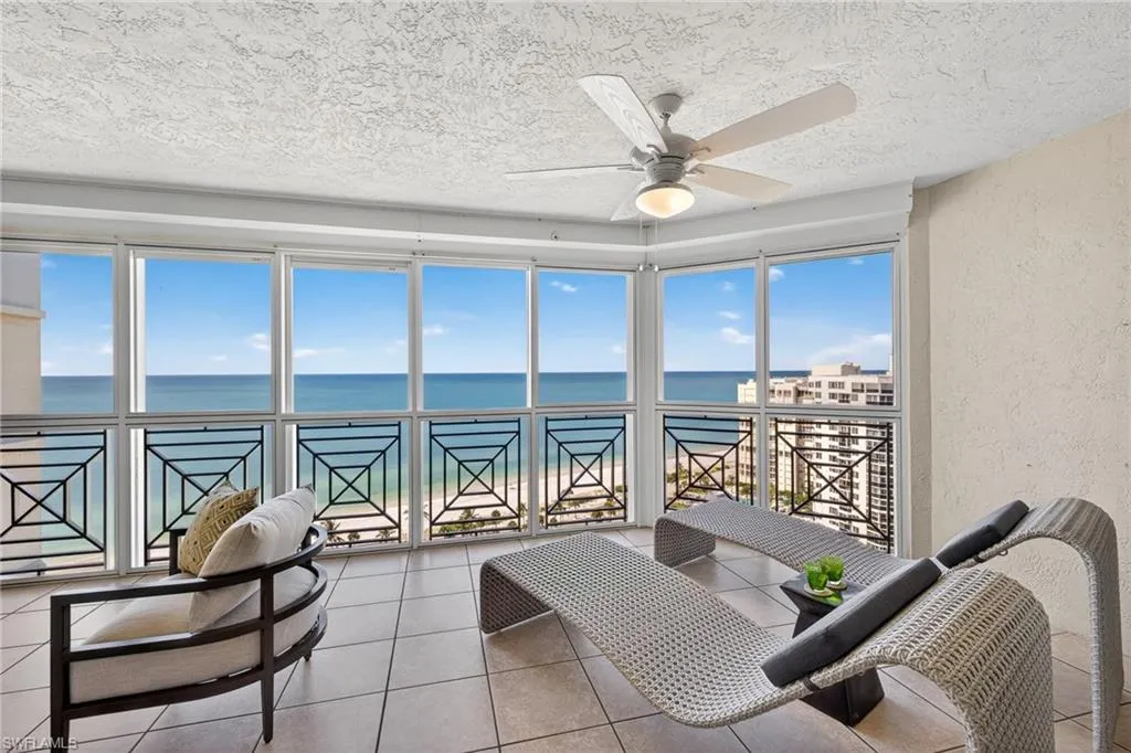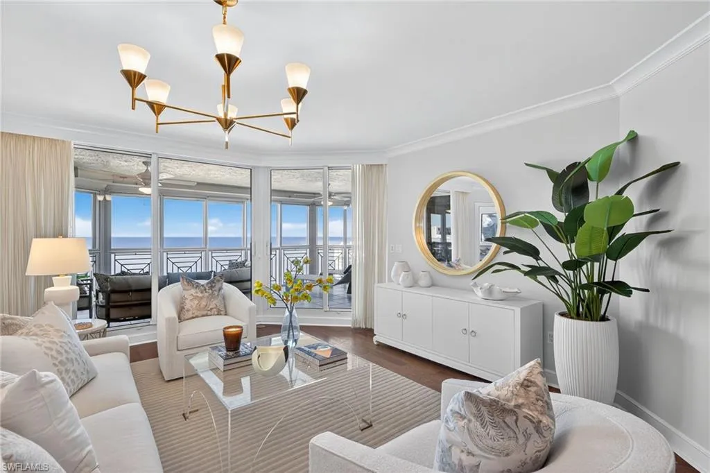 Unobstructed Gulf views and sparking Venetian Bay vistas create an unparalleled experience in this 19th floor jewel. Each room features unique captivating tropical panoramas. Freshly painted throughout, upgraded light fixtures, new carpet in the two ensuite guest rooms, and masterfully refurbished decor by Palm Staging and Design, highlight the timelessness of this exquisite unit. Beautiful hardwood floors throughout the living room, office/den and primary bedroom add richness to the artistic scheme. The office, which could easily be converted to serve as a fourth bedroom with an existing door that closes from the hallway providing a full bath and walk-in closet, and also provides full access to a beautiful Gulf side lanai. When entertaining is important, you will love the large screened balcony off the living room, with peaceful views, a bar with lovely cabinetry and a wine cooler. The kitchen area affords additional Bay views, a double Viking refrigerator/freezer, a new wine cooler, white cabinetry and granite countertops. With three bedrooms plus the den, four full baths and two deeded garage parking places, what’s not to love? Your guests will enjoy sunrise views from their private ensuite bedrooms while the primary bedroom, living room and a luxurious office features peaceful sunsets. “The Brittany” is an exceptional high-rise on Gulf Shore Boulevard, and residents delight in the four guest suites, an upscale lobby and beautiful community areas, a pool, in-ground spa, grilling area, tennis, bocce, fitness room, private massage room and the ease of walking along the beach or strolling to Venetian Village for dining or shopping.