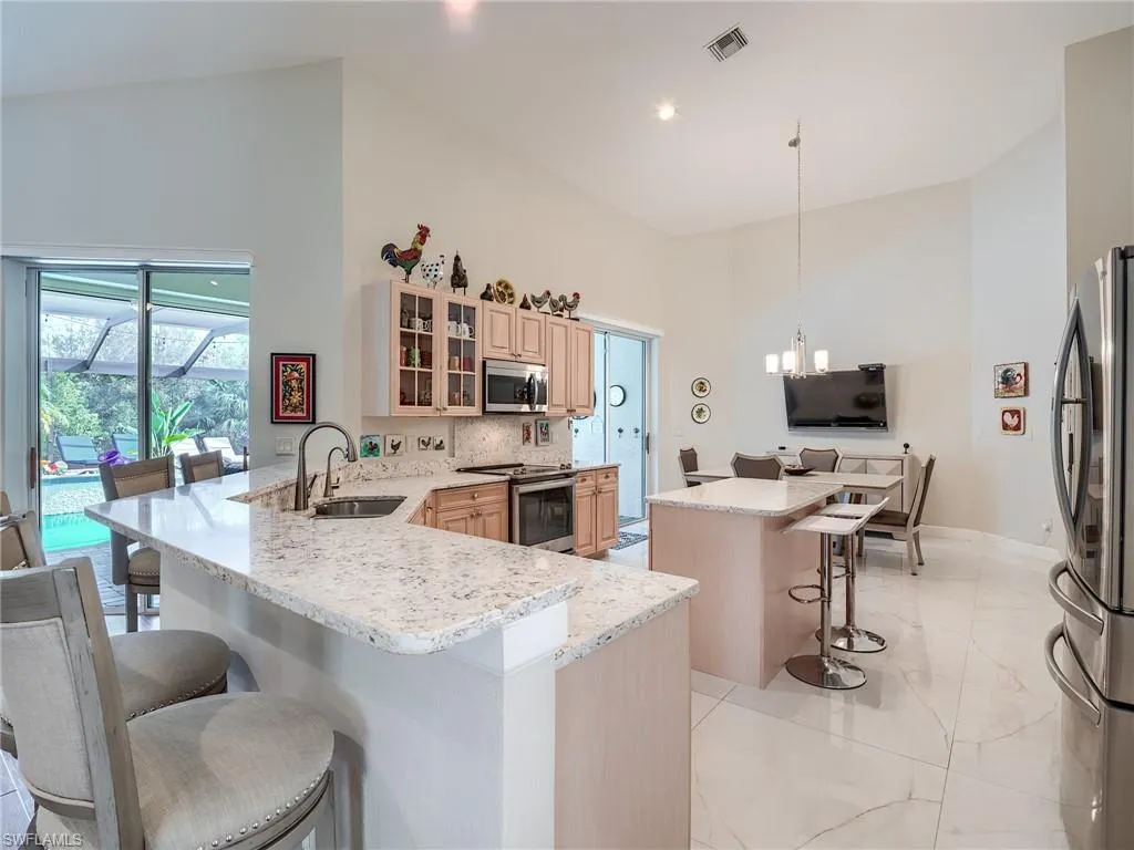 Exceptional private 18,000+ sq ft lot and customized home located on quiet street in Cedar Glen in Shadow Wood. The owners doubled the size of the lanai which features an open lounging area with all day sun, picture screen windows, outdoor kitchen, covered and uncovered dining area, resort style pool with water feature, above ground hot tub and fire pit. Entertaining is easy for family, friends, grandkids or pets with this outstanding space. Inside the home incorporates a great room floor plan with vaulted ceiling and easy access to the kitchen. The kitchen has quartz countertops, 36 x 36 porcelain flooring, center island for prepping, eat-in-bar and eat-in kitchen. Lots of bedroom spaces with large primary ensuite, guest suite and two bedrooms with private bath that could be used as flex rooms for second office, gym or hobby room. Den is located off great room and has a closet and could be used as a 5th bedroom. Primary suite features a sitting area, private exit to lanai, 2 custom closets, and renovated bath. Additional features include 2018 roof, oversized garage, electric hurricane shutters on lanai and front door, and lanai pavers. Shadow Wood Country Club has 54 holes of golf, social/dining, tennis and bocce. The new lifestyle Amenity Center is under construction and will include 2 resort style pools, a kid’s pool, restaurant and bar, 6 indoor pickleball courts, racquet pro shop and grab and go cage. The Commons Club membership offers access to the private beach club, fitness center and spa, pickleball, social activities, private restaurant, playground, and lap pool. Memberships optional. Great location close to airport, shopping, restaurants, beaches and health care. Give me a call for your private tour today.