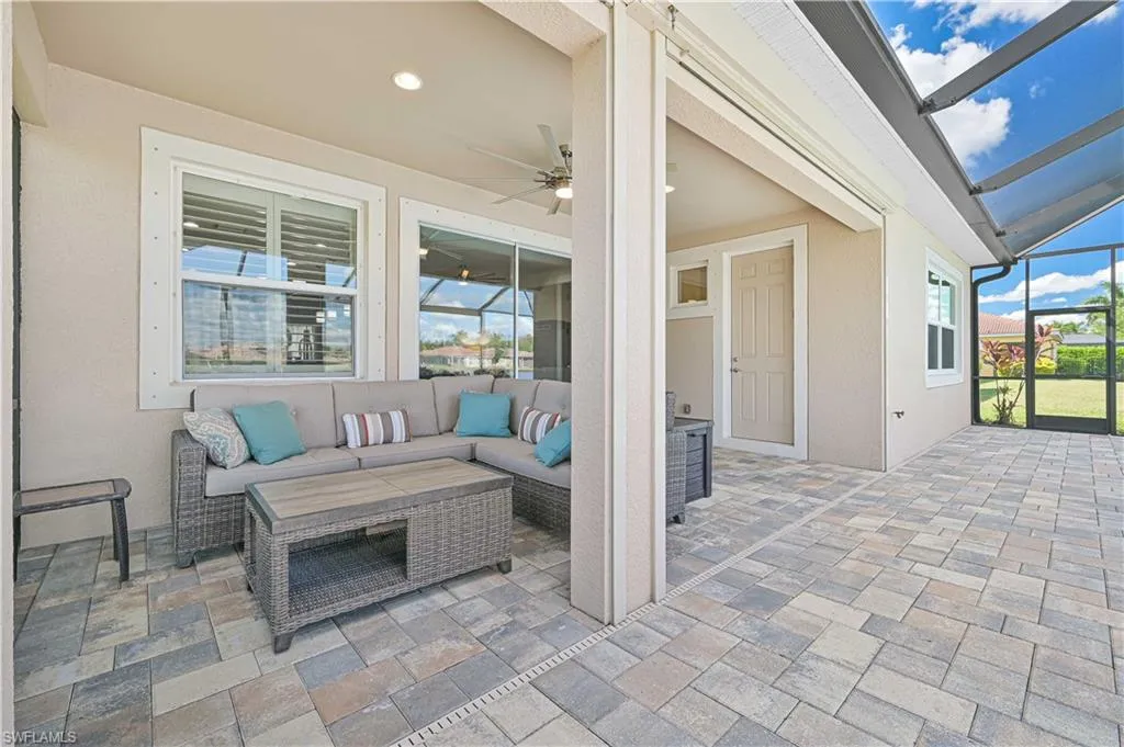 Built for durability and peace of mind, the home features all impact-resistant windows, roll-down hurricane screens on the lanai, and is not in a flood zone. The widened driveway leads to a two car garage with epoxy flooring and overhead storage, adding both style and practicality.