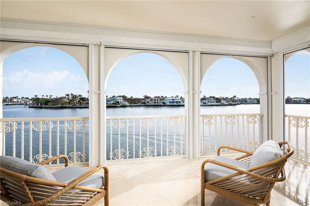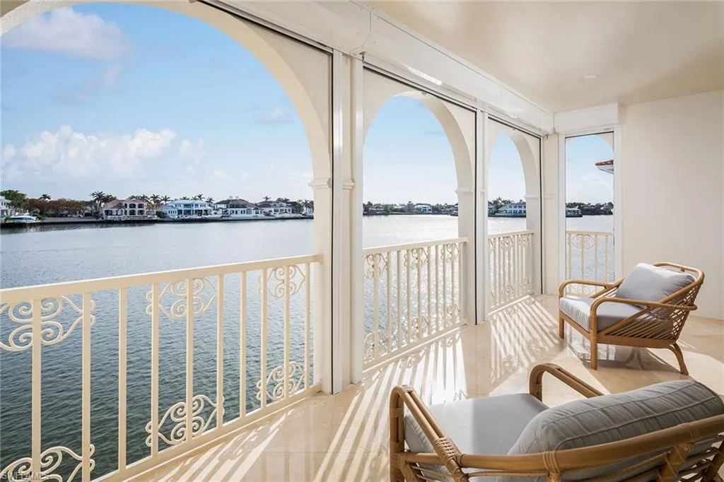 Indulge in the ultimate waterfront lifestyle at Venetian Villas, a desired bayfront enclave on prestigious Gulf Shore Boulevard. N. This move-in-ready three bedroom, three bath villa offers sweeping views of Doctors Bay and exquisite designer finishes throughout. The open floorplan features a spacious great room with new wide plank wood-look tile flooring, custom built-ins and a stylish dry bar with a beverage refrigerator, ideal for entertaining. Light streams through impact glass sliders that open to an oversized balcony, ideal for taking in the serene bay views. The refreshed gourmet kitchen boasts quartzite countertops, custom cabinetry and top-of-the-line appliances, including Wolf, Sub-Zero and Miele. The primary suite is a private retreat with its waterfront balcony, custom built-ins, elegant wall treatments and a newly renovated spa-like bath featuring dual sinks, a soaking tub and a large glass-enclosed shower. Two additional bedrooms and updated baths complete this stunning home. New air-conditioning units were installed in 2023. Residents of Venetian Villas enjoy a waterfront pool, private boat slips available for a nominal fee and beach access. This pet-friendly, gated community features only 32 unique villas, an on-site manager, and proximity to Venetian Village’s world-class dining and shopping. Don’t miss your chance to own this slice of paradise and experience the best of Naples living!