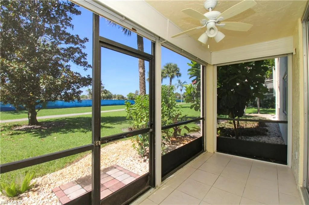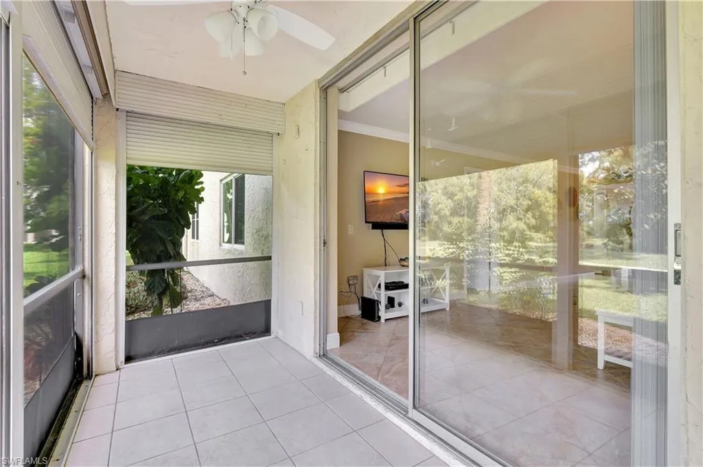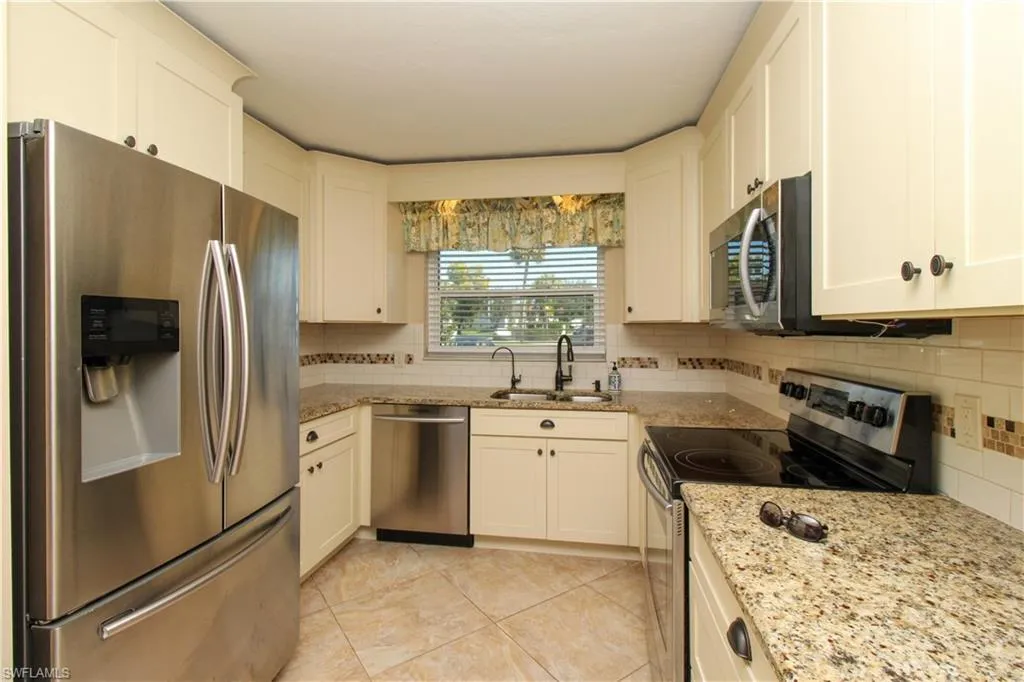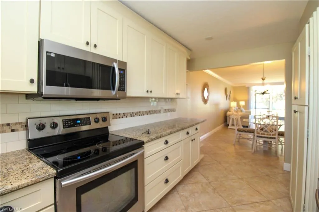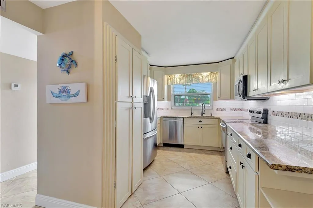 Welcome to this beautiful remodeled 2-bedroom, 2-bath condo located on the first floor in the desirable Golden Gate at The Fairways at Par One (55+ community) With 1,100 square feet of tastefully decorated living space, this unit offers comfort, style, and modern amenities. Key Features: Largest unit in the Par Community on the market First floor unitno stairs or elevator to worry about. Fresh interior paint and baseboards, newer tile installedgrout cleaned throughout. Remodeled one-of-a-kind chef’s custom kitchen. Stainless steel appliances: Brand new garbage disposal and new Microwave (all under warranty) *Reverse osmosis water system in the kitchen for drinking water. Self-closing cabinetry for convenience. Full Sized In-unit washer and dryer for added convenience. Newer large diagonal tile in living areas with brand new cleaned grout. Beautiful crown molding in living areas. Updated water heater. Newer AC unit (5 years). New 50″ Smart TVs in LR. Plantation shutters throughout for added beauty and privacy. The primary bedroom has brand new beautiful carpeting just installed October 2025, and features a king-sized bed with a brand new mattress, a large walk-in closet, and a private office workstation. The primary bathroom includes a modern shower and granite countertops. The guest room is furnished with a queen-sized bed and brand new mattress, with a bathtub and shower in the guest bathroom. TV hook-up in primary bedroom, Fiber Optic cable throughout. Front door on keyless entry system for added convenience. Enjoy peaceful mornings or evenings on your private screened-in lanai, perfect for sipping coffee or enjoying the fresh SW Florida breeze. New Hurricane impact windows so you are secure during hurricane season. Hurricane shutters on lanai. New furniture throughout.
