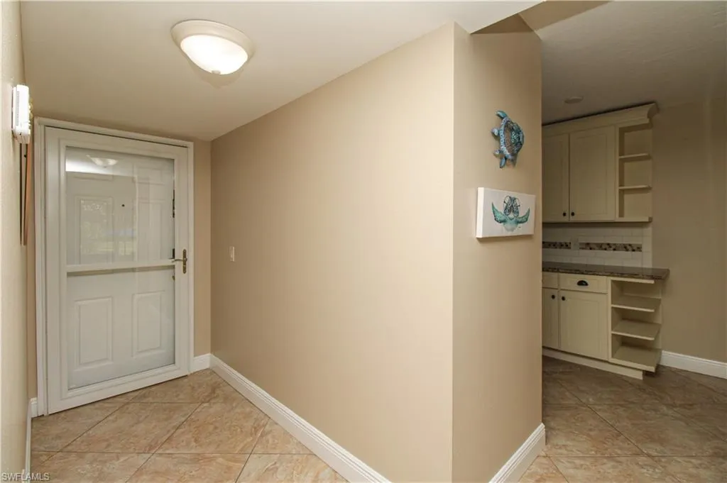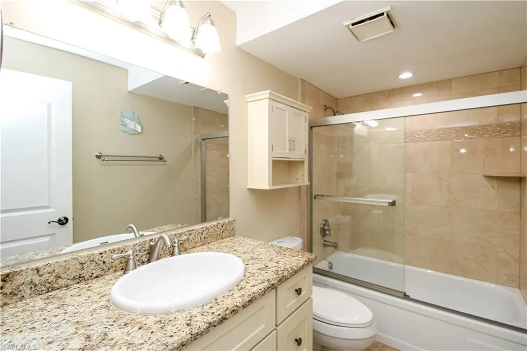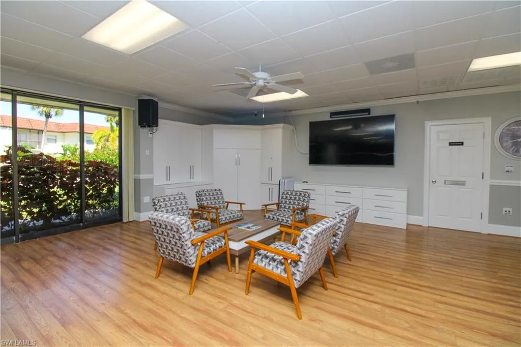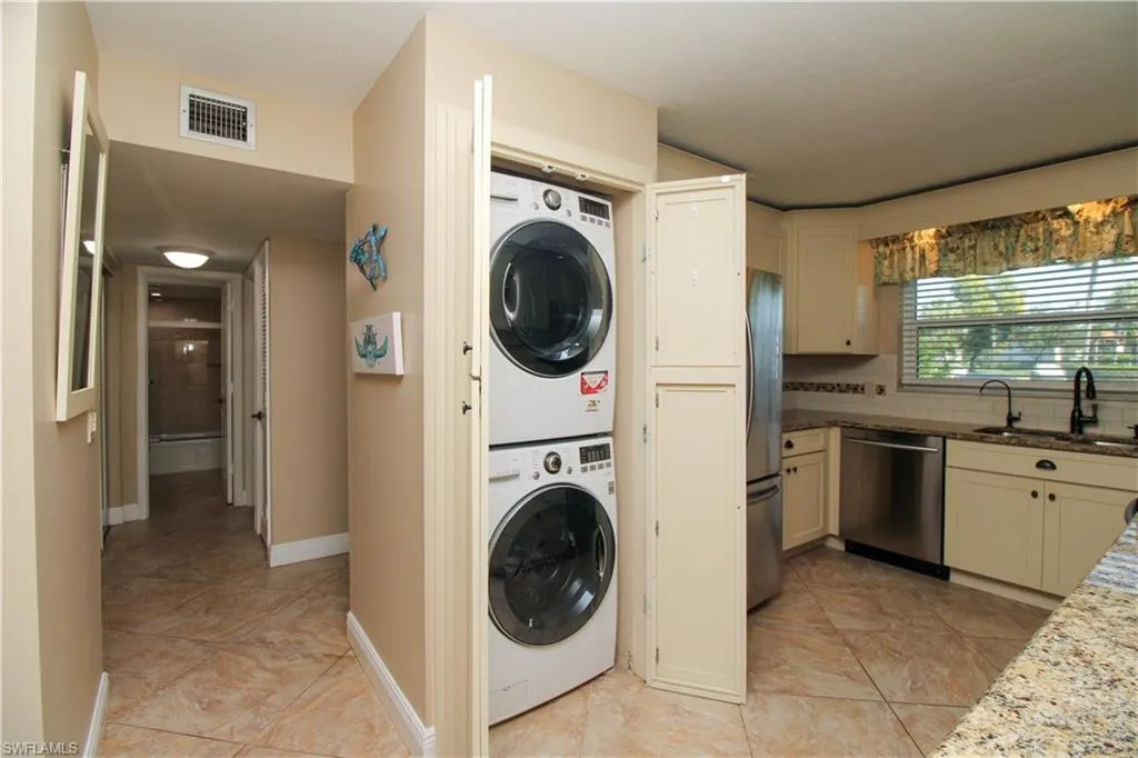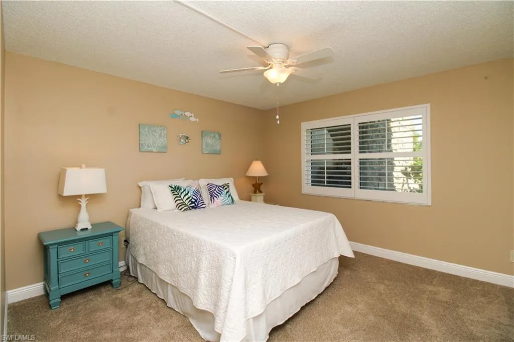 Welcome to this beautiful remodeled 2-bedroom, 2-bath condo located on the first floor in the desirable Golden Gate at The Fairways at Par One (55+ community) With 1,100 square feet of tastefully decorated living space, this unit offers comfort, style, and modern amenities. Key Features: Largest unit in the Par Community on the market First floor unitno stairs or elevator to worry about. Fresh interior paint and baseboards, newer tile installedgrout cleaned throughout. Remodeled one-of-a-kind chef’s custom kitchen. Stainless steel appliances: Brand new garbage disposal and new Microwave (all under warranty) *Reverse osmosis water system in the kitchen for drinking water. Self-closing cabinetry for convenience. Full Sized In-unit washer and dryer for added convenience. Newer large diagonal tile in living areas with brand new cleaned grout. Beautiful crown molding in living areas. Updated water heater. Newer AC unit (5 years). New 50″ Smart TVs in LR. Plantation shutters throughout for added beauty and privacy. The primary bedroom has brand new beautiful carpeting just installed October 2025, and features a king-sized bed with a brand new mattress, a large walk-in closet, and a private office workstation. The primary bathroom includes a modern shower and granite countertops. The guest room is furnished with a queen-sized bed and brand new mattress, with a bathtub and shower in the guest bathroom. TV hook-up in primary bedroom, Fiber Optic cable throughout. Front door on keyless entry system for added convenience. Enjoy peaceful mornings or evenings on your private screened-in lanai, perfect for sipping coffee or enjoying the fresh SW Florida breeze. New Hurricane impact windows so you are secure during hurricane season. Hurricane shutters on lanai. New furniture throughout.