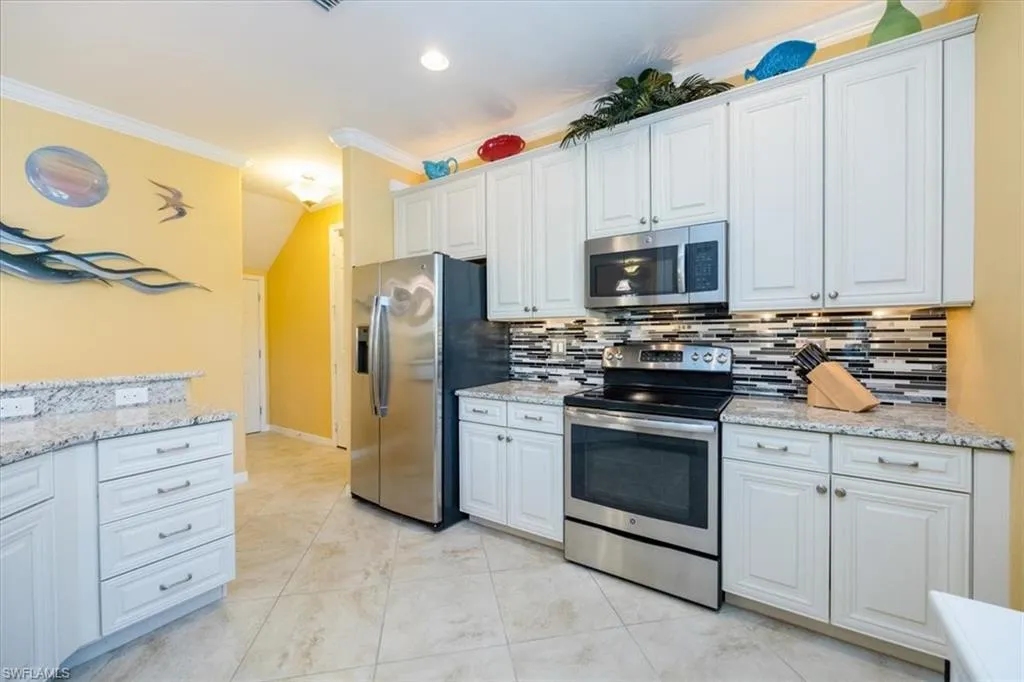 This is the home you have been waiting for! Incredible features include: upgraded tile flooring and luxury vinyl throughout (no carpet), concealed doorway screens, custom plantation shutters, crown molding throughout, custom primary closet organizer, soft close kitchen cabinets with under and above cabinet lighting, pantry pull-out shelves, and so much more! The thoughtful open floor plan offers main level living with a spacious living room, elegant formal dining area, gracious kitchen, convenient half bath and large storage closet. Upstairs offers a grand primary suite, two generous guest bedrooms with full bath, and an expansive flex space with built-in work area. You will certainly have peace of mind with the impact window and doors, as well as a new tile roof and exterior stucco and paint. This home is situated on a coveted corner lot overlooking a charming courtyard, and relatively close to the entertaining amenity center. The nearby amenity center showcases a resort style pool, movie theater, cafe, fitness center, bocce, pickleball, tennis and more. Ole is located near everyday conveniences, as well as the Naples iconic beaches, fine dining, shopping and entertainment centers.