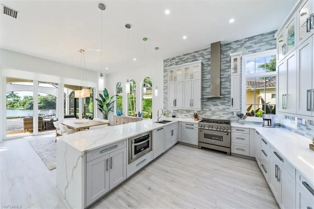 The greatly expanded chef’s kitchen is equipped with custom cabinetry, a six-burner gas range, quartz countertops with glass tile backsplash that extends from floor to ceiling. The entertainment area features a custom driftwood bar, custom cabinets, quartz countertops, a wine cooler, and a television.