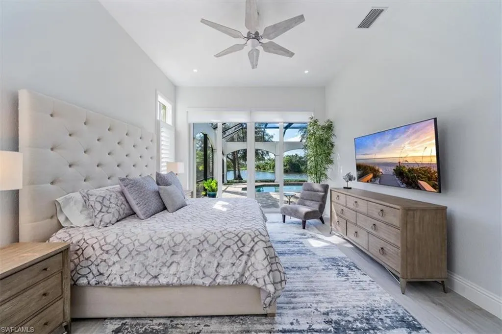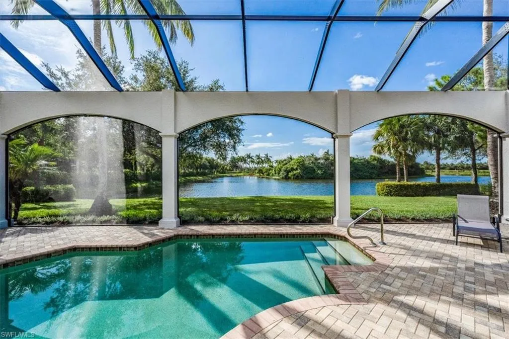 Enhancing the home’s allure are 10-foot glass sliders that span the entire rear of the house, offering seamless access to the lanai and framing picturesque views of the pool and lake beyond. Spanning 2,471 air-conditioned square feet, the home includes two guest bedrooms, each with its own ensuite bath, ensuring comfort and privacy for family and guests. Exterior upgrades include an on-demand water heater, a two-car air-conditioned garage with epoxy floors, hurricane-rated doors and windows, a new saltwater pool system, and significantly upgraded landscaping.