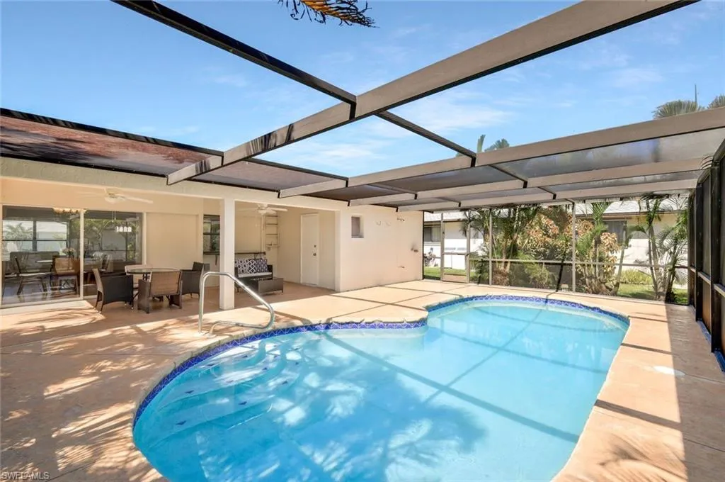This lovely pool home is located on a corner lot with a huge circular driveway and is in move in condition. The roof was replaced in 2023. The home has never flooded or had hurricane/water damage. Enter the screened entryway into a bright and sunny great room with vaulted ceilings. An open concept living provides for views through the dining area out to the pool. The kitchen features wood cabinets, granite counter tops and a large pantry. The refrigerator and dishwasher are brand new. The bathrooms have been updated, and the main shower is brand new. Outdoors there is a large lanai with a stamped concrete deck. The screened swimming pool is surrounded by palms for privacy. The home is connected to city water and sewer with no assessments. The neighborhood is quiet yet convenient. This is a great place for you to call home.