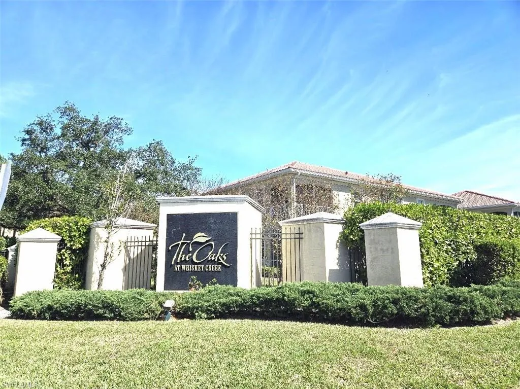 Location, Location, Location! This 1st Floor 2 Bedroom + Den/2 Bathroom Condo with Garage is located in the Intimate Community of Oaks at Whiskey Creek in the heart of Fort Myers is a short ride to the beach and near everything! This solid concrete block unit was built in 2014 with a tile roof and paver driveway. A foyer invites you into a lovely great room with volume ceilings, tile flooring laid on the diagonal, recessed lighting and sliding impact glass doors out to the lanai w/a private landscaped view. Generous floor plan for entertaining with the eat-in-kitchen, breakfast bar and great room open for entertaining. Kitchen boasts 42-inch cherry wood cabinetry, granite counters and stainless appliances along with pendant lights. Owner’s Bedroom is spacious and has two large windows and a coffered ceiling. The ensuite bathroom has a shower and a vanity w/dual sinks & a granite countertop along with a walk-in closet. The light & bright guest bedroom and den share a bathroom. There’s inside laundry and an extra-long one car garage w/shelving & a storage closet on the lanai. Community is pet friendly and has a beautiful Pool and Spa for relaxing. Convenient location to enjoy all that Fort Myers has to offer – beaches, shopping, restaurants, entertainment, schools, physicians, places of worship, parks & recreation and more! Short drive to RSW Airport & I-75 too! Perfect year-round residence, vacation home or seasonal rental for Investors!