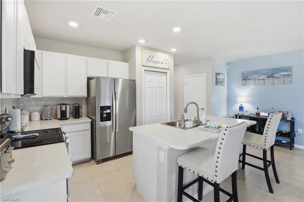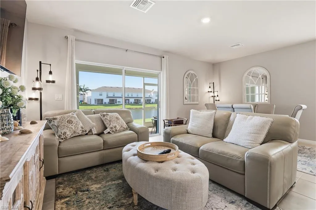 FALL IN LOVE with this exceptional North Naples townhouse being sold Turnkey/Furnished, but NEGOTIABLE nestled in Meadowood one of the MOST SOUGHT after communities. LOW, LOW HOA FEES! NO FLOOD INSURANCE REQUIRED! NO CDD! Step into this exceptional and spacious move-in ready lakefront end-unit townhome. The home boasts 3 bedrooms plus loft, 2.5 baths with a one car garage and two car paver driveway. Full concrete block construction even on the second floor, beautifully appointed stainless steel appliances, newly installed decorative backsplash in kitchen, ceramic tile flooring on the first floor, quartz kitchen countertops, Jack and Jill bathroom, washer and dryer, blinds on all the windows. Full-glass secondary exterior storm door, accordion “Hurricane” shutters on exterior of home a $6,000.00 upgrade, offering peace of mind for the new owner. Private oversized screened-in lanai for relaxation.. Meadowood Features a fitness center and gathering room, a gorgeous lap pool with long lake views, kids playground lot and half court basketball. Located in an A+ Collier County Public Schools district. The community is within close proximity to Founders Square, featuring entertainment, eateries, medical plaza and more. The Collier Blvd Corridor provides convenient access to Naples championship golf courses, pristine beaches, beautiful parks and the vibrant dining and shopping of downtown 5th Avenue.