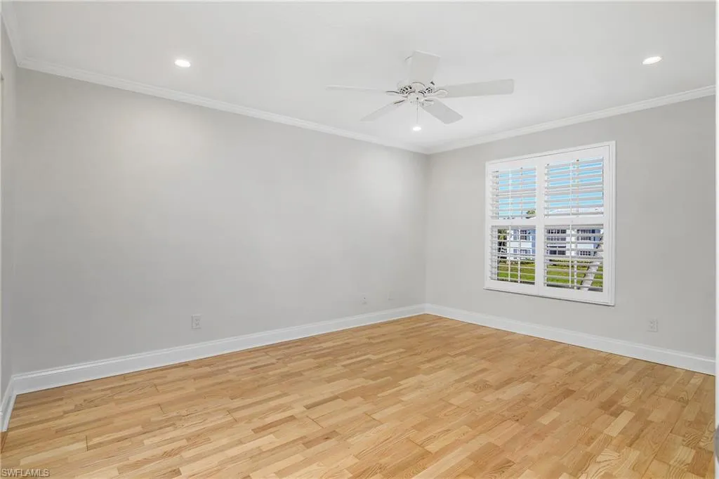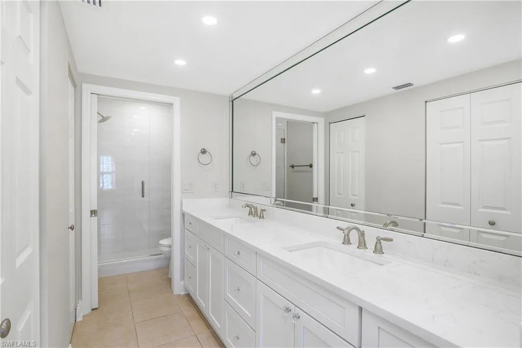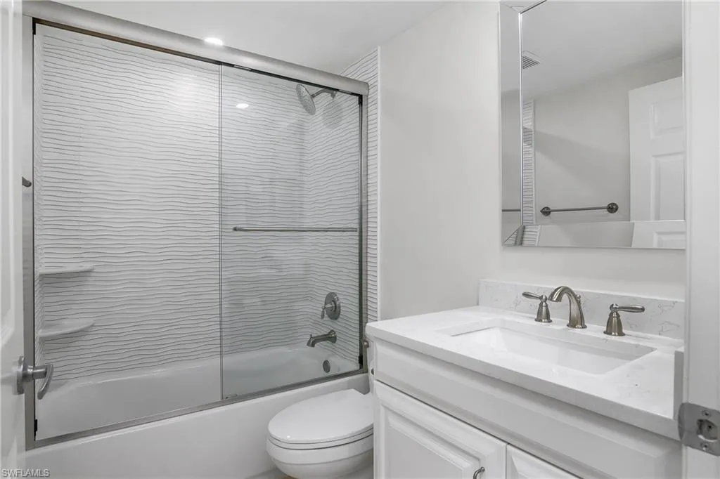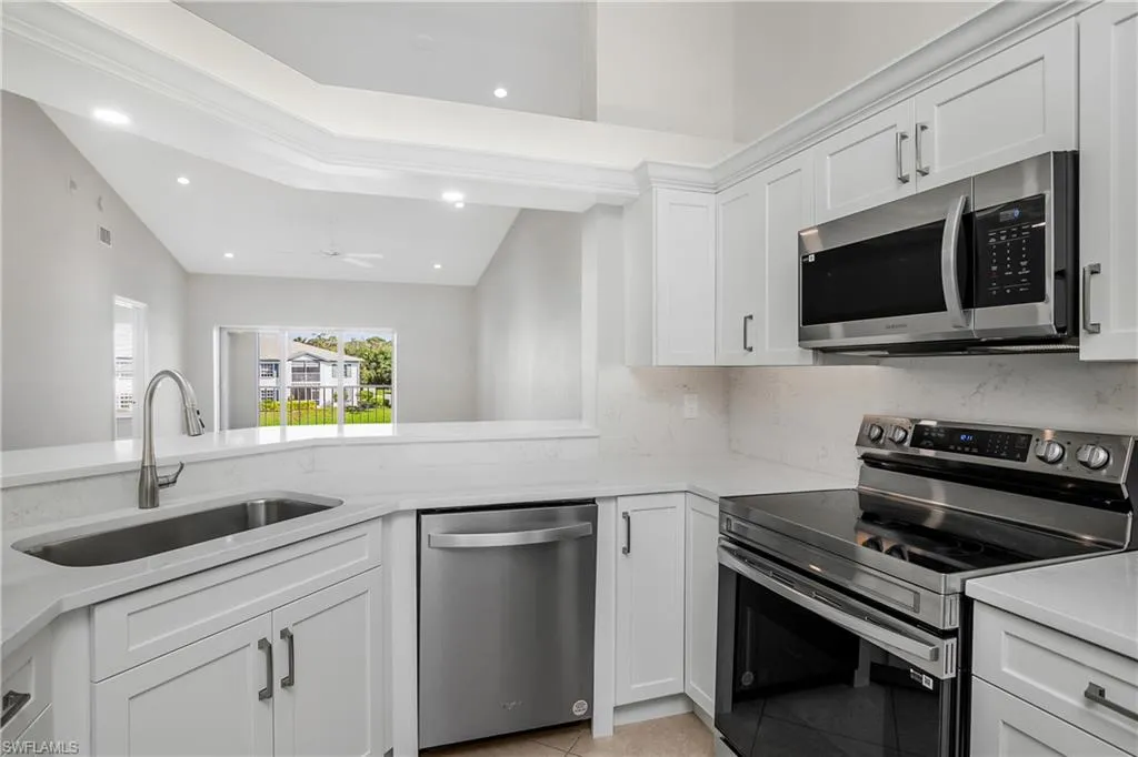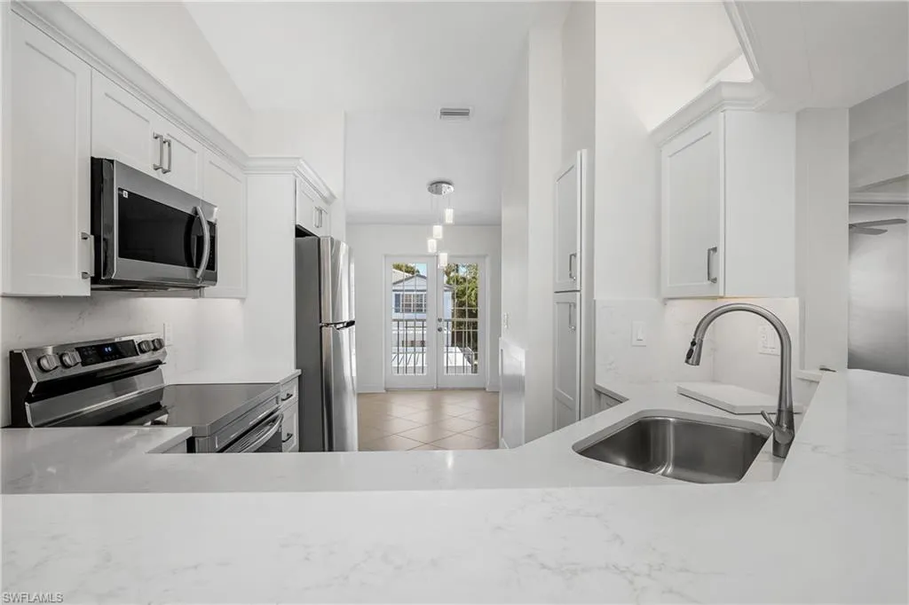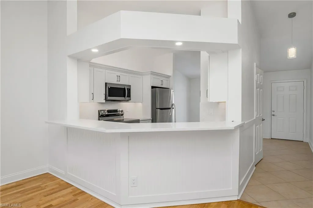 Beautiful Renovated Condo with new everything, Appliances, HVAC System & hot water heater are all new. Interior features real wood flooring, tile & guest bedroom with carpet. Quartz countertops in kitchen and both bathrooms also have all new cabinetry & hardware. Glass enclosed shower in master & guest bathrooms, Plantation shutters, crystal light fixtures in dining area and hallway. Custom Mirror & all new recessed lighting throughout. Exterior features two lanais for you morning coffee and your evening cocktails. Lake & fountain views from the rear lanai. New painting of complex in 2023 and new roofs in 2024. Polybutylene pipes replaced as well. You are steps to the pool, spa and clubhouse from this condo’s location. This condo is located in the most sought-after community of Pelican Bay with private beach access for owners with Beach services. Just bring your towel and sunscreen. leave the rest to the wonderful beach service people who set up your umbrellas and chairs. Two Beachfront restaurants and bars, community center with state-of-the-art gym, tennis courts and pickleball., canoes, sail boats and walking paths. So many amenities in this community. A must-see condo to appreciate all the renovation features. Located between the Ritz Carolton Beach Hotel and the Waterside Shops. Minutes to Mercato and downtown Naples.