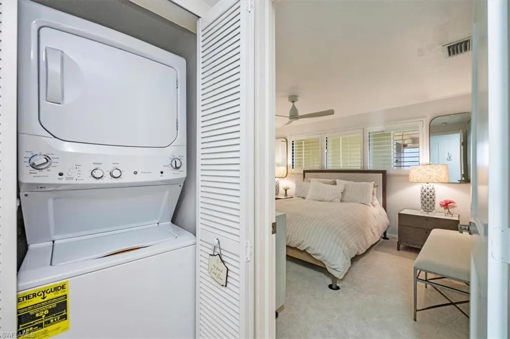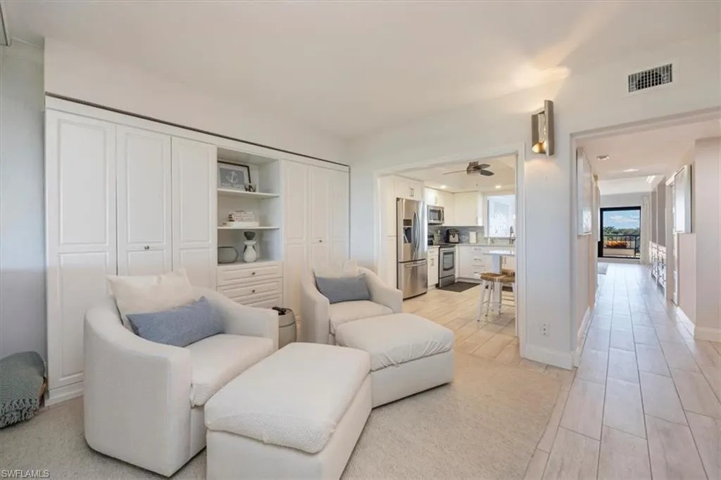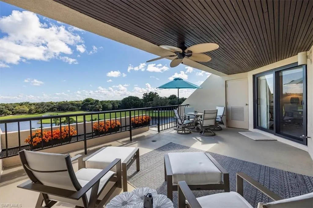 Two balconies provide panoramic views, one east-facing over the golf course and manicured grounds, the other west-facing toward the Gulf for sunset skies.