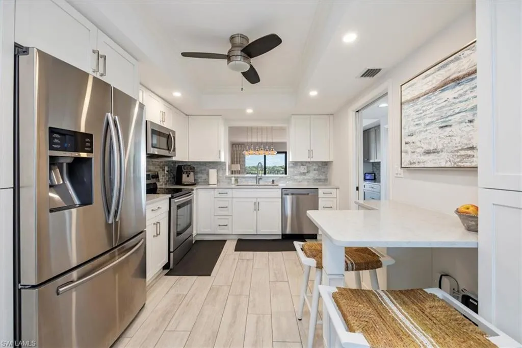 Interior features include Italian porcelain wood-look tile flooring, white shaker cabinets, quartz countertops, glass tile backsplashes, and new stainless steel appliances. A versatile flex space with built-in shelving includes twin Murphy beds, ideal for guests or a home office.