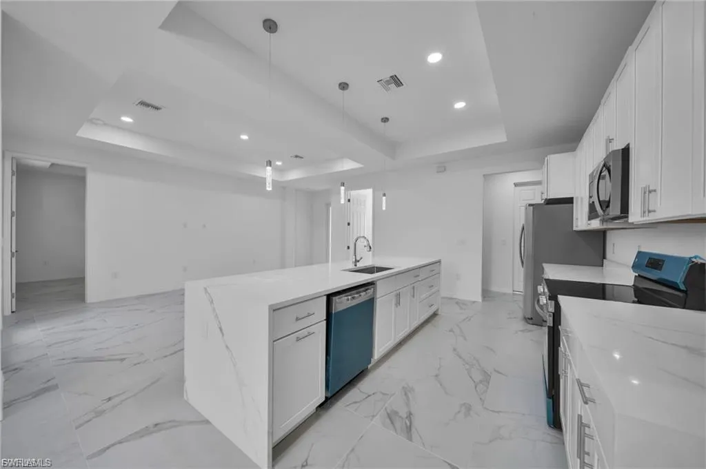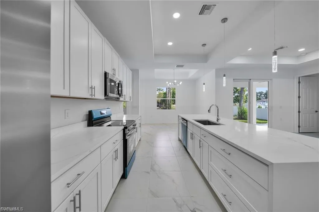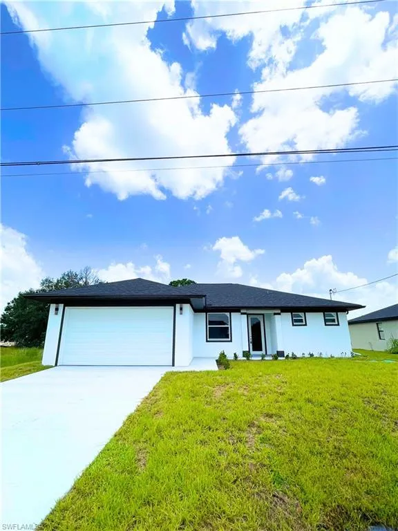 New construction featuring 3 bedrooms, a den, 2 bathrooms, and a spacious open floor plan filled with natural light. Highlights include a jumbo-sized kitchen island, white cabinetry, quartz countertops, and stainless steel appliances. The primary suite offers dual walk-in closets and a walk-in shower. Porcelain tile throughout, plus a separate indoor laundry room for added convenience. Enjoy a covered lanai, landscaped yard, and large backyard—perfect for entertaining. 2-car garage and 1-year builder warranty included. Move-in ready!