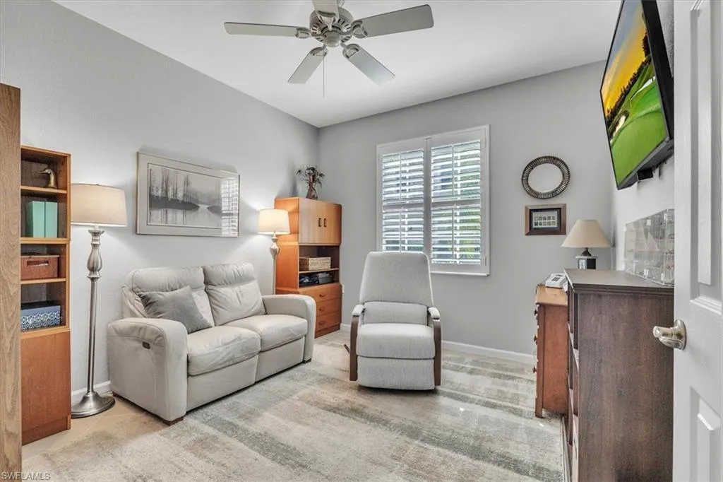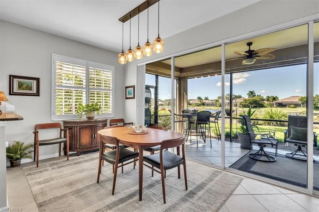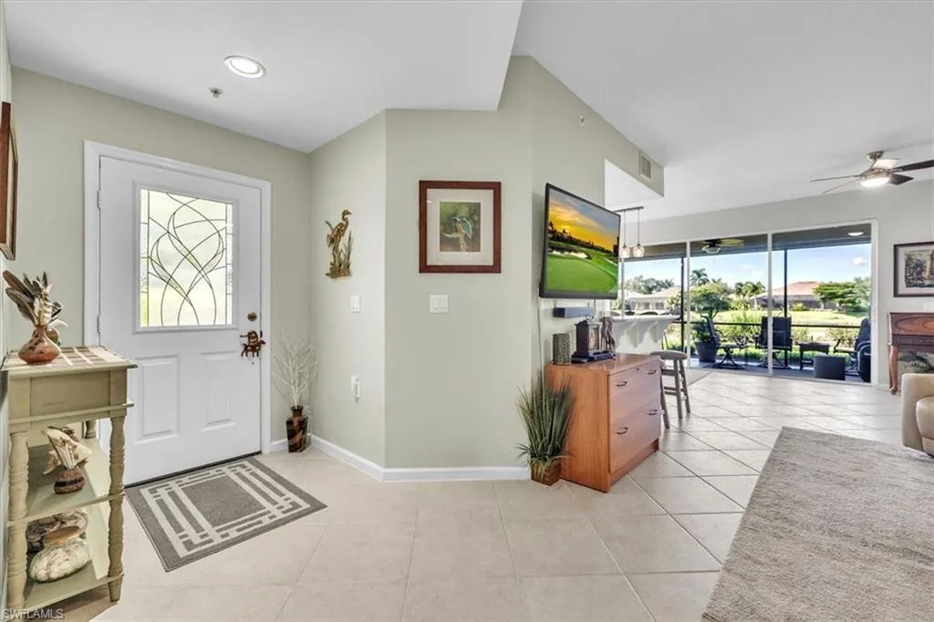 Great opportunity to own a first floor unit in the gated Verandah community in the desirable Pebblebrook neighborhood. The exceptional home features 1532 sq. ft. of living space with 2 Bedrooms, Den, 2 Baths, screened in Lanai and two car garage. As you enter the home you realize that you are in a special place. The open feel greets you into the spacious family room and adjacent dining room with diagonal tile throughout. The kitchen is open and also has a view of the family room. It has newer appliances, granite countertops, attractive backsplash and plenty of cabinet space with a nice pantry. A spacious breakfast room area complement the main living area. The primary bedroom is large with access to the Lanai and features plantation shutters. The primary bathroom has dual sinks and a nice vanity with upgraded lighting and lighter color cabinets. Add to this a walk in shower and large tub and you have everything you need in this Master suite. The expansive Den has two French doors which add privacy if you decide to use the space for additional sleeping areas. The second bedroom and second bath with a walk in shower also provide plenty of space for your guests or family when they visit. Newer washer and dryer and AC unit, plantation shutters throughout and an epoxy garage floor with overhead racks for storage also add to the appeal of this home. Pebblebrook has new roofs and new paint which was done recently. The screened in Lanai with Storm shutters has one of the better views in Verandah with a view of hole #17 on the Jack Nicklaus designed course and a lake in the background. Enjoy the evening sunsets from the spacious lanai with your favorite beverage and while you entertain friends and family. Pebblebrook offers all of its residents a separate community pool/spa, fitness area and community room. Additionally as a member of the Verandah Club you will have access to 2 Championship golf courses designed by jack Nicklaus and Bob Cupp, tennis facility, state of art of fitness facility, resort style pool, pickleball, 9 miles of walking and jogging paths, kayaks, playground, dog park, multiple restaurants and an active calendar to meet everyone’s needs. Don’t miss out on the opportunity to own your own piece of paradise.