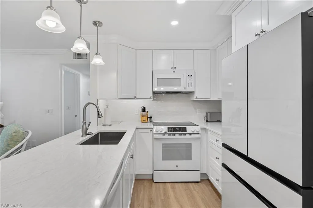 Welcome to your island retreat at Sanibel Moorings, a beautifully landscaped East end gulf-front community known for its lush botanical gardens and resort-style amenities. This 2-bedroom, 2-bath direct gulf-front condo offers easy beach access and a bright, open layout designed for comfort and relaxation. Step inside to find a spacious, recently renovated living and dining area that flows seamlessly to the larger beachfront screened lanai. With new coastal modern furnishings and décor, the condo feels bright and fresh. The kitchen is well-appointed with new appliances, white cabinetry, and quartz counters, making meal prep a breeze. Both bedrooms provide plenty of space for family and guests, while the primary suite features private access to the second lanai and an en-suite bathroom with an oversized shower and double vanity. Sit on either porch and take in your private beach views while listening to the waves roll on shore. Sanibel Moorings is beloved for its unmatched amenities, including tropical gardens, two heated pools, tennis and pickleball courts, fitness center, boat dockage, onsite rental office, and direct beach access. Whether you’re seeking a personal getaway or a strong rental investment, Unit 121 offers the best of island living and easy beach access. Experience the charm of Sanibel—where world-class shelling beaches, bike paths, and island dining are all within easy reach.