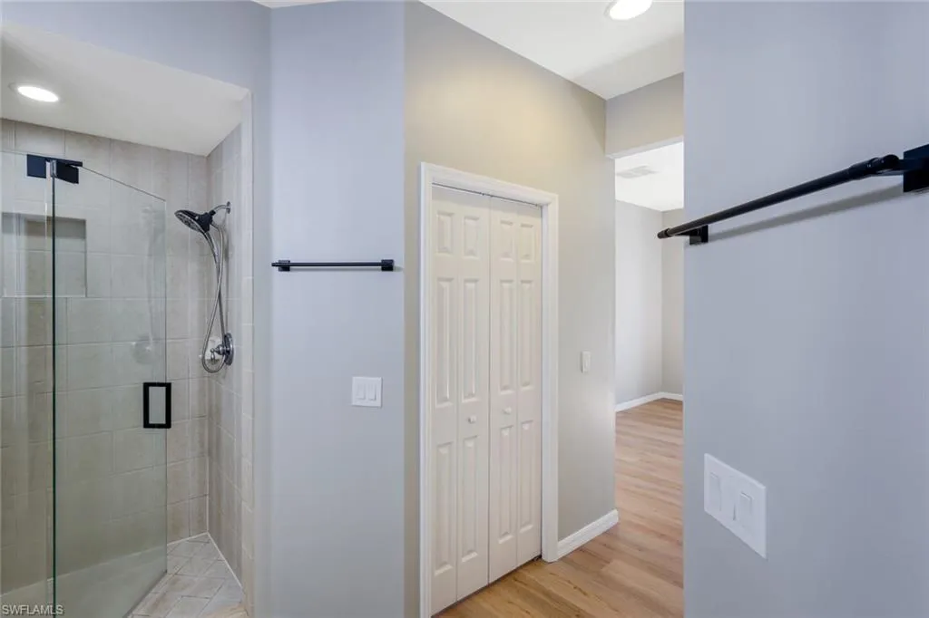 The primary suite features luxury vinyl plank flooring and a custom accent wall, adding warmth and a modern touch. A screened-in balcony extends your living space outdoors, offering a peaceful view of the surrounding greenery.
