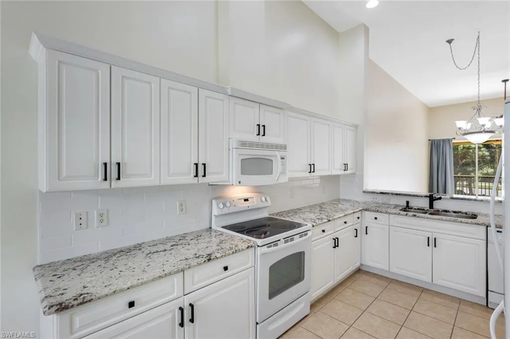 Inside, the layout is open and airy, with high ceilings and an abundance of natural light. The kitchen is thoughtfully appointed with granite countertops, upgraded cabinetry, a tile backsplash, and durable tile flooring that flows seamlessly through the main living areas.