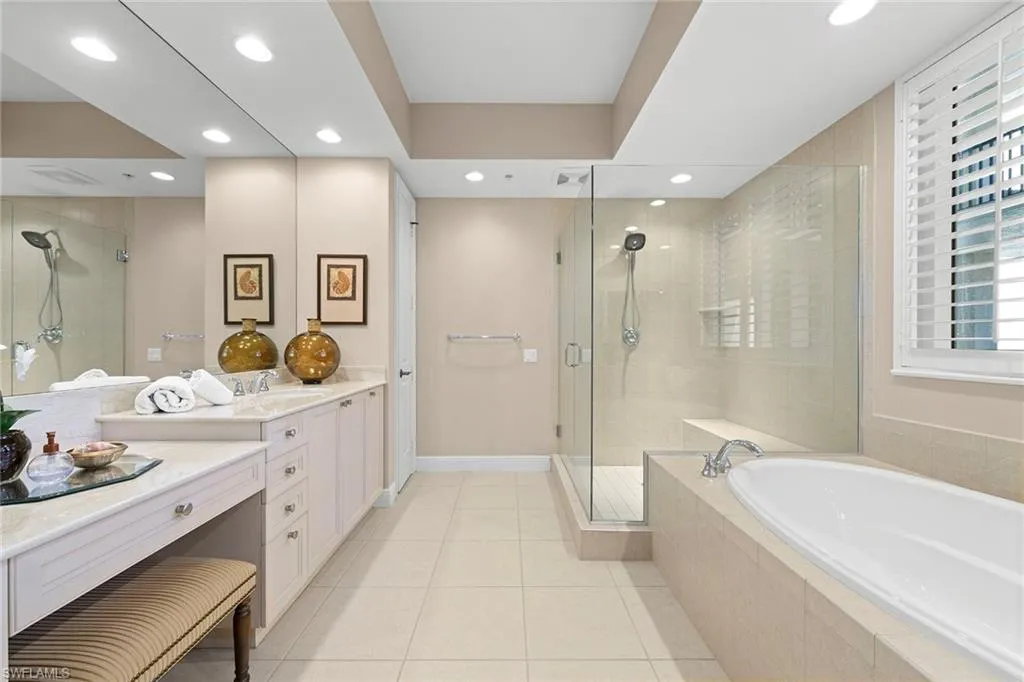 Experience affordable luxury in this beautifully furnished mid-rise condominium at Castella in The Colony Golf & Bay Club. Designed for relaxed sophistication, this three-bedroom, two-and-a-half-bath residence offers a bright, open layout that blends comfort, style and functionality. The spacious living area extends onto an expansive screened lanai, ideal for taking in tranquil bay views, lush landscaping and breathtaking sunsets. The owner’s suite and a guest bedroom open directly to the lanai, creating seamless indoor-outdoor living and a serene setting to enjoy the view. The owner’s suite features a generous walk-in closet and a spa-inspired bath with a soaking tub and glass-enclosed shower, while the two guest bedrooms share a convenient Jack-and-Jill bathroom for privacy and comfort. The kitchen is well-appointed with stainless steel appliances, abundant cabinetry, and a large island ideal for casual dining or entertaining. Additional features include hurricane protection shutters, a private entry courtyard, two assigned garage spaces with secure access and dedicated extra storage. Residents enjoy resort-style amenities, including a tropical lagoon pool with a waterfall and spa, sun deck and social pavilion with grilling stations. Ownership also includes access to The Colony Bay Club, a private beach island and activities such as kayaking, canoeing, tennis, pickleball and bocce with no additional membership required. Near Coconut Point Mall and only 20 minutes from Southwest Florida International Airport, this Castella residence combines coastal elegance, convenience and exceptional value.