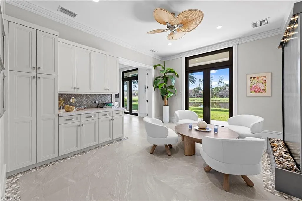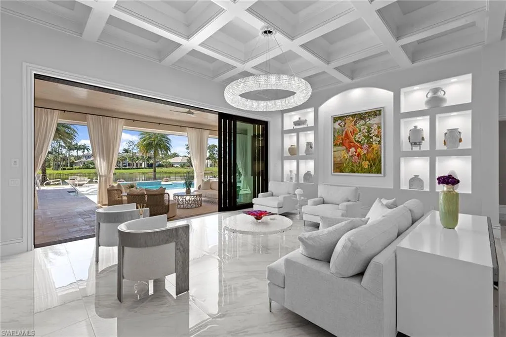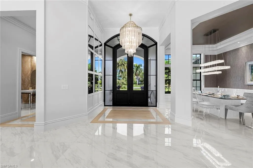 Redefining luxury renovations in desired Quail West Golf & Country Club. Perched on just over ¾ of an acre, this premier lot offers lush organic landscaping alongside classic hardscapes. Breathing new life into this home, Imperial Custom Homes has discerningly integrated modern elegance alongside functionality seamlessly throughout its generous 8,000-plus square feet. Upon entering the marble-laden foyer one’s sightline goes from the designer chandeliers to the serene water views which are on display throughout the entire home. Beyond two 96-bottle capacity wine refrigerators in the foyer bar, an ample-sized dining room complements the expansive living room; all fully furnished with designer touches. For the chefs, find a kitchen fully equipped with two ovens including a pizza oven and rotisserie, two dishwashers, gas cooktop, instant water heater and ample storage space. Cozy up by the fireplace in the great room just in time for cooler winter nights or relax by the waterfall in the spa retreat sitting room. If outdoor cooking overlooking the water and golf course, custom pool and spa, with Sonos playing in the background is opted, the similarly equipped exterior kitchen has a pizza oven, rotisserie, grill, separate refrigerator and ice maker. Completely redesigned the primary suite and primary bath sit in their own section of the house past the first of two offices. No expense was spared in crafting the ideal product, from custom Cypress wood trim to the marble clad walk-in shower featuring five shower heads to complement the separate steam shower. Through the home gym, which has access to the interior courtyard, an in-law suite with its kitchen and en-suite bath. Taking the elevator upstairs, two additional king-sized bedroom suites, each with sitting areas and designer finishes emanating their own style can be found. In between is a perfect coffee deck overlooking palm trees, water and the golf course. Down the stairs, marvel in the custom metal railing work leading out to private courtyard and the hidden gem of this residence. Parking for over six cars is found in the garages with plentiful spaces in the courtyard and alcove. Above the newly built portion, which has room for three lifts if desired, find a separate guest house adorned with luxurious finishes, its kitchen, washer and dryer, and living quarters. If entertaining guests, family or friends for short-and-long-term stays, this remarkable home is optimally laid out for each resident to have their own spaces comfortably and privately. Become enchanted by every lavish detail 6536 Highcroft Drive has to offer today.