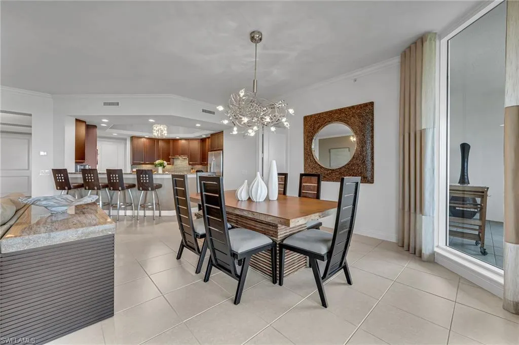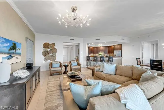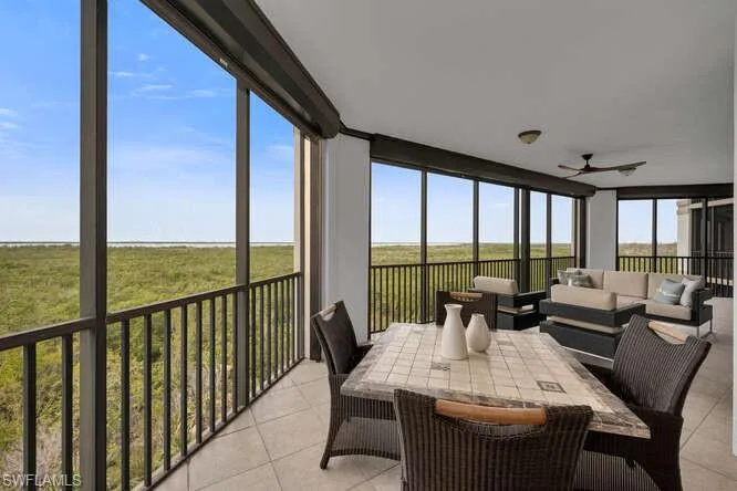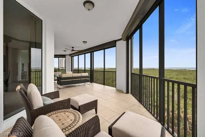 Enjoy the sunset views of a high-rise with the quiet privacy and convenience of a mid-rise. Offered furnished, this exquisite upper floor residence boasts panoramic views of lush nature preserves, sparkling Estero Bay waters, and the barrier island known as Lover’s Key. The building’s open-air atrium entry provides a warm and welcoming touch, blending indoor sophistication with the serenity of lush greenery, soft natural light, and the gentle breeze wafting in from outside.Meticulously updated with designer lighting, fans, elegant window treatments and modern furnishings, this serene property offers an elegant yet relaxed atmosphere. The chef’s kitchen features luxurious wood cabinets, stylish backsplash, breakfast bar, center island, and premium appliances such as a Sub-Zero wine cooler. Ideal for entertaining or just relaxing with family, the inviting living and dining areas open to the spacious wrap around lanai with floor to ceiling glass doors and electric hurricane shutters. A restful primary suite offers a spa-like bath, an enormous custom closet, and direct access to outdoor living. Enjoy unparalleled community amenities including a private beach pavilion, bocce, private restaurant, tennis, fitness center, and a tropical resort-style pool and spa. Castella offers a quiet tropical setting on 11 acres with resort level amenities including exclusive access to The Bay Club offering unparalleled luxury while dining and enjoying the beaurtiy of Estero Bay and beyond. The Colony at Pelican Landing is just moments away from Bonita Beach, Coconut Point Mall, and SWFL International Airport.