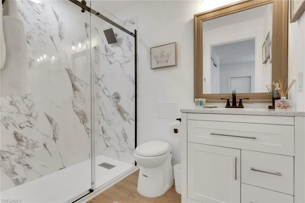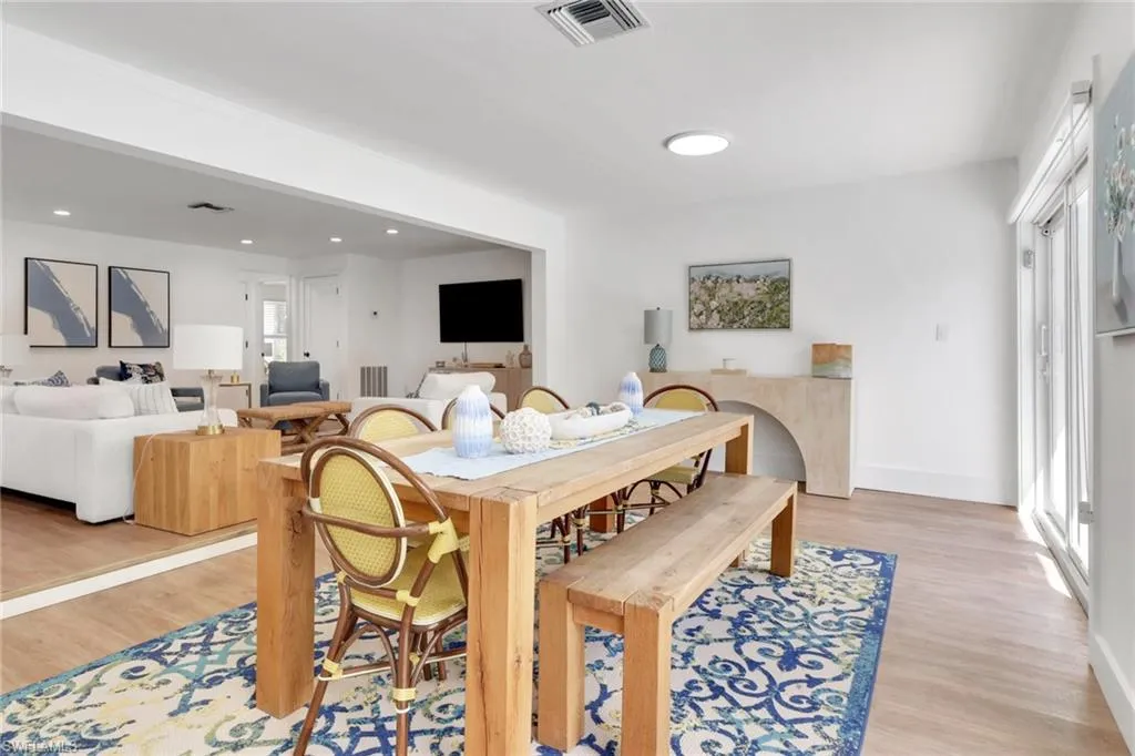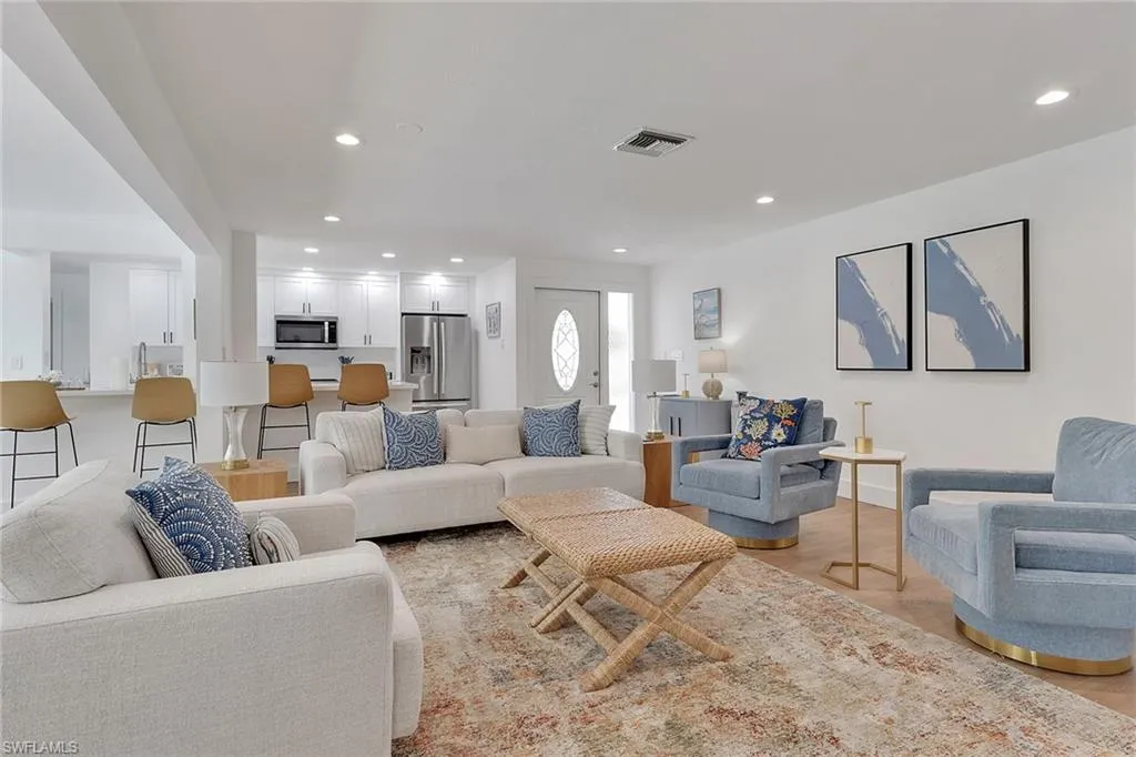 Inside, coastal-inspired design meets modern luxury with an open layout featuring quartz countertops, custom cabinetry, luxury vinyl flooring, and stylish furnishings throughout. The 4-bedroom, 3-bathroom layout has been reconfigured for both functionality and flow, creating a bright, inviting atmosphere ideal for entertaining or relaxing after a day on the water.