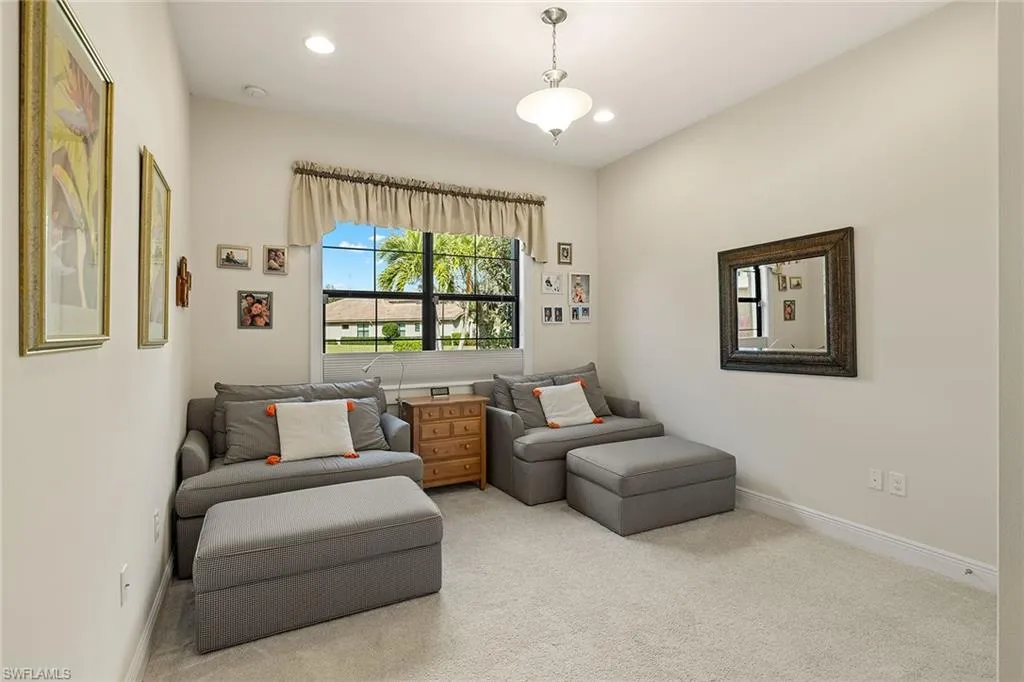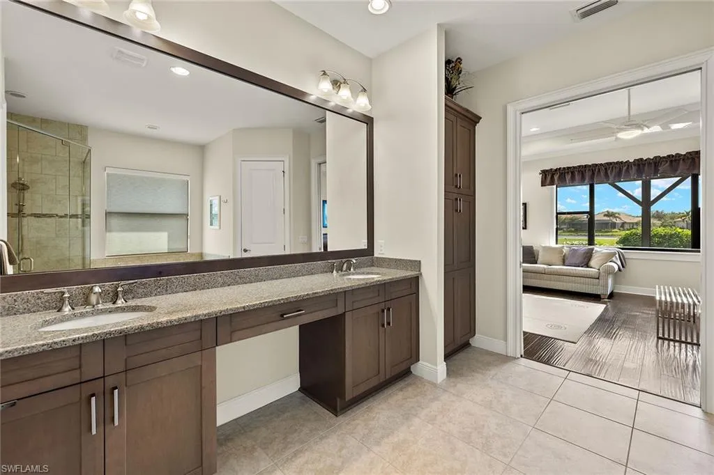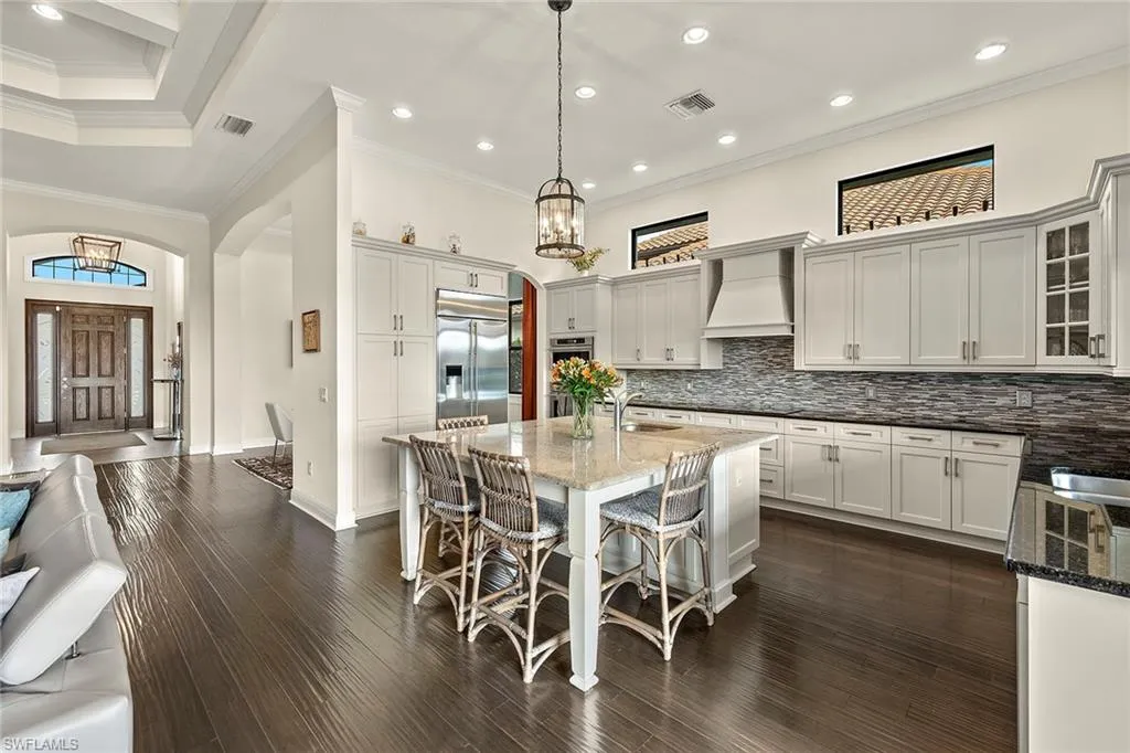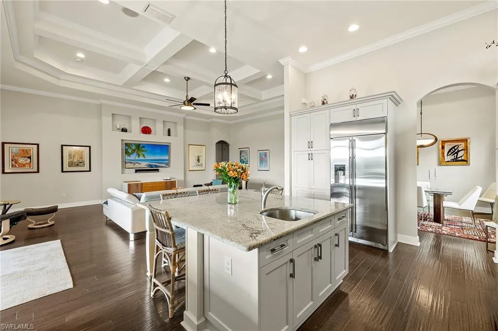 This residence includes a full golf membership, allowing immediate access to the greens upon closing. In TwinEagles, this 3,020-square-foot home offers refined living with four bedrooms, a den and four baths. The open floor plan showcases thoughtful design and meticulous craftsmanship throughout. A gourmet kitchen serves as the centerpiece, featuring custom white cabinetry, stainless-steel appliances, granite countertops and a designer backsplash. The kitchen seamlessly connects to the living and dining areas, creating an inviting space for intimate gatherings or larger-scale entertaining. The primary suite provides a private retreat with dual vanities, a soaking tub and a separate shower. Outdoors, the residence presents an exceptional setting for enjoying the Southwest Florida lifestyle. The covered lanai includes a fully equipped outdoor kitchen overlooking a heated pool, spa and water feature. The picture-screen enclosure frames serene views of the lake and golf course. TwinEagles encompasses 1,115 acres of natural beauty and tranquility. Residents enjoy access to two championship courses: the Talon Course, designed by the Nicklaus Group, and the Eagle Course, designed by Steve Smyers. The recently renovated clubhouse features dining and social spaces, along with bocce courts, a Himalayan putting green, fitness center, tennis and pickleball courts, a resort-style pool and a tiki bar.