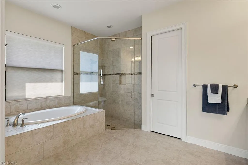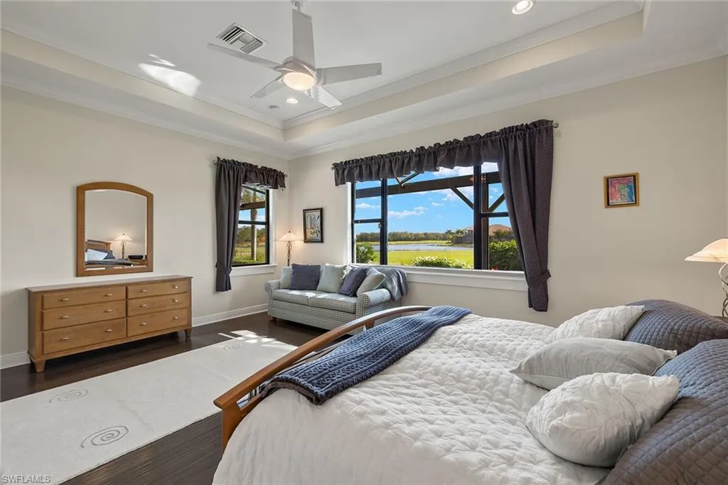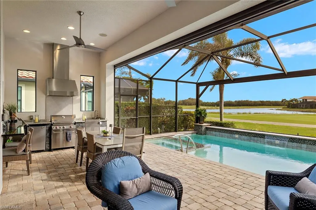 The primary suite provides a private retreat with dual vanities, a soaking tub, and a separate shower. Outdoors, the residence presents an exceptional setting for enjoying the Southwest Florida lifestyle. The covered lanai includes a fully equipped outdoor kitchen overlooking a heated pool, spa, and water feature. The picture-screen enclosure frames serene views of the lake and golf course.