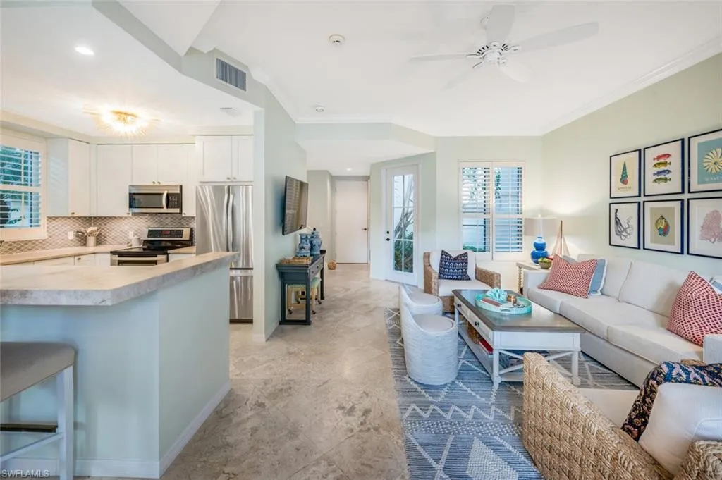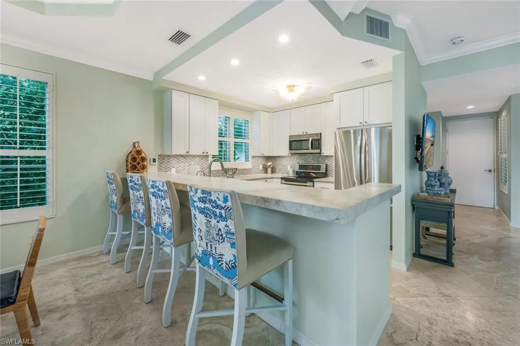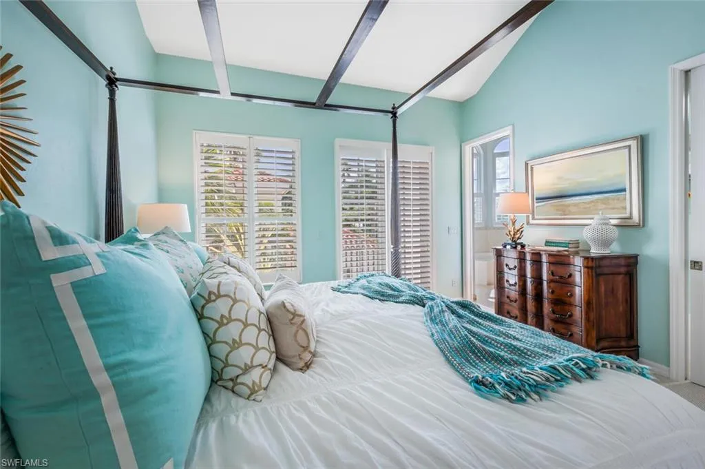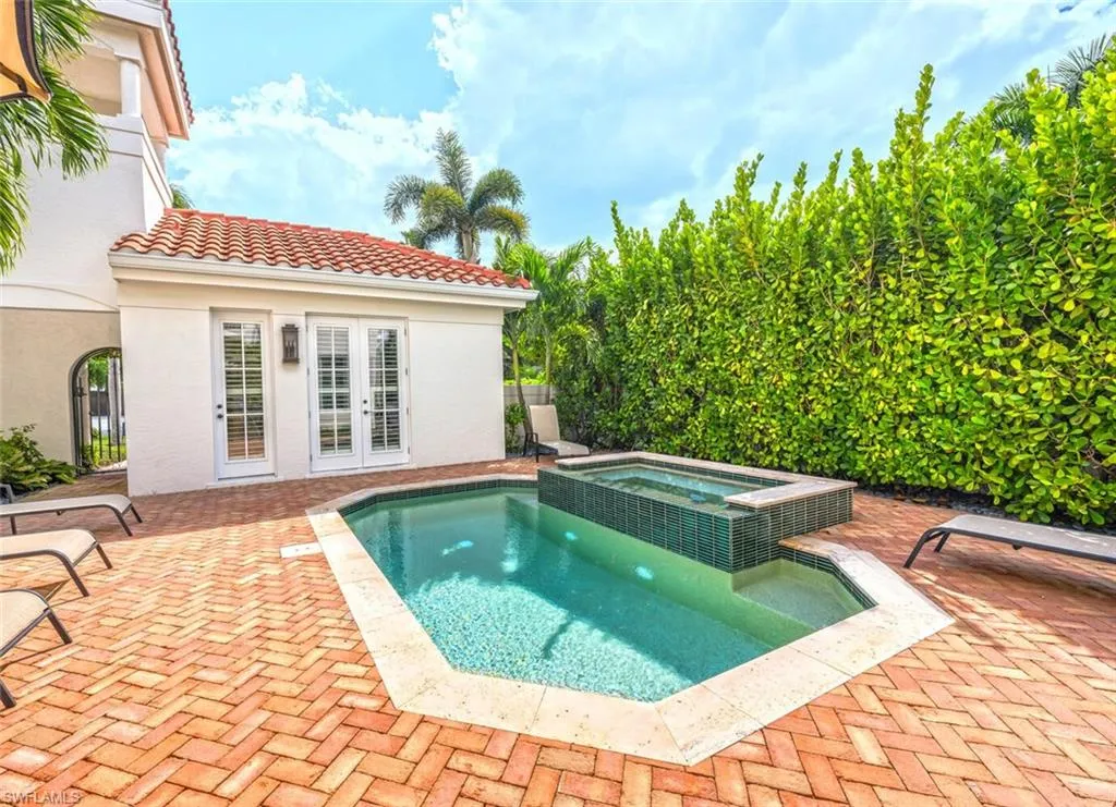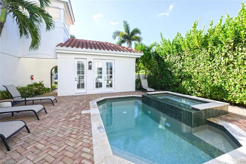 Ideally situated just blocks from iconic Fifth Avenue South, this 4 bedroom, 3 bath end-unit villa offers the ultimate Naples winter retreat. Just inside your private gate is a secluded tropical courtyard where a sparkling pool, relaxing spa, and ample seating create the perfect space for entertaining or unwinding in style. The chef’s kitchen is thoughtfully appointed with Quartzite countertops, stainless steel appliances, a striking backsplash, and a breakfast bar with counter-height seating. Just beyond, the light-filled dining area invites gathering and conversation. The living room exudes cottage-chic charm with plantation shutters, French doors, and elegant coastal décor. Upstairs, the stunning primary suite features soaring ceilings, a four-poster king bed, and a private balcony overlooking the pool, your own serene sanctuary. The spa-inspired primary bath includes dual sinks, a walk-in shower, and a luxurious soaking tub. Guests will feel right at home with beautifully furnished accommodations — one with a queen bed, another with a twin-over-full bunk, and a fourth poolside cabana featuring twin bunks and an adjoining full bath. With a two-car garage discreetly accessed from the alley and every detail designed for comfort and sophistication, this residence embodies the essence of Old Naples living — elegant, relaxed, and effortlessly exceptional. Live Exceptionally in Old Naples!