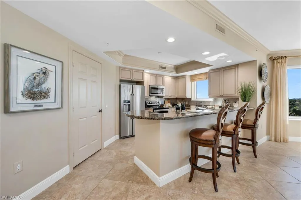 This exquisite residence boasts breathtaking views of the golf course, lake, Estero Bay, and distant silhouettes of New Pass leading to the Gulf of Mexico. Blending indoor sophistication with the serenity of lush greenery, soft natural light, and the gentle gulf breeze, this tranquil property offers an elegant, yet relaxed, atmosphere. The open kitchen features luxurious wood cabinets, breakfast bar, and like-new premium appliances. Ideal for entertaining or just relaxing with family, the inviting living and dining areas open to the spacious wrap around lanai with floor to ceiling glass doors and electric hurricane shutters. A restful primary suite offers a spa-like bath, custom closets, and luxurious marble finishes. Located away from the main living area are private guest rooms with ensuite baths and a balcony. You can take advantage of Navona’s elegant amenities, including a sophisticated lobby overlooking the pool, a state-of-the-art fitness center, a welcoming social room, elegant guest suites, and a private theater. You will also have access to unparalleled community amenities including a private beach pavilion, bocce, private restaurant, tennis, fitness center, and concierge service. Residents enjoy the privilege of a Private Beach Club, while a coveted private membership to the Bay Club promises mesmerizing sunsets over Estero Bay. Situated just moments from Coconut Mall and the highly regarded Lee Memorial Health System, this property effortlessly blends tranquility with urban convenience, making it the perfect sanctuary for the discerning homeowner.