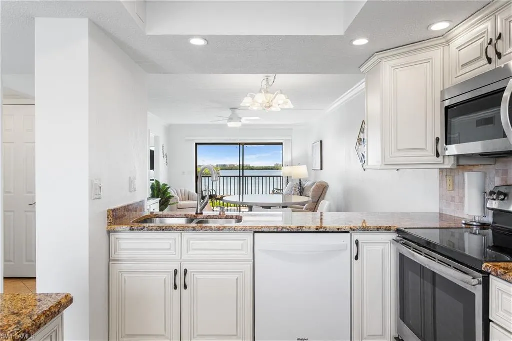 ~This wonderful condo boasts a reconfigured kitchen with walls removed, making this condo an open-concept floor plan, ideal for entertaining. Granite counters, custom wood cabinetry, recessed lighting, tumbled marble backsplash, newer Whirlpool fridge, dishwasher, and washer/dryer, tiled on the diagonal throughout make this the perfect beach retreat.