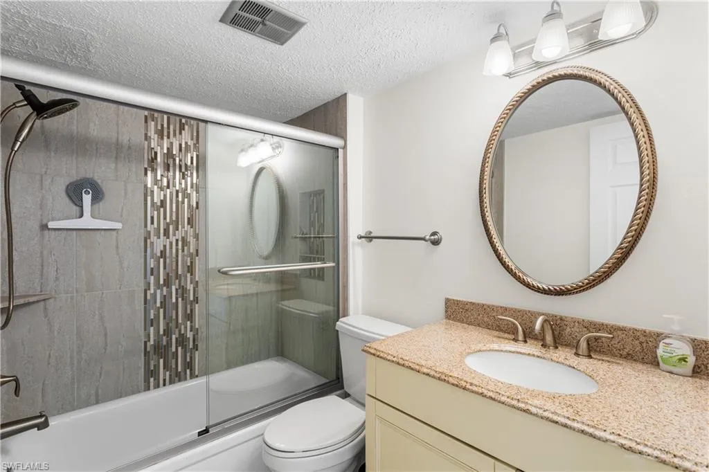 ~Both baths have white vanities, granite counters, new plumbing/lighting fixtures, and new heavy glass shower doors. The Primary bath has a shower and the guest bath has a shower/tub combination, both with custom tile work.