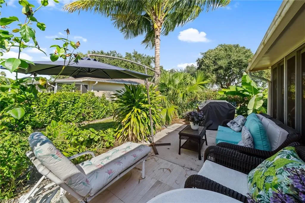 End-unit villa in the highly desirable Glades Golf & Country Club! This charming 2 bedroom, 2 bath residence offers a light and open floor plan with windows on three sides, bringing in beautiful natural light. The tiled lanai with glass and screens provides year-round enjoyment and extends your living space with peaceful garden views. A bonus outdoor patio is perfect for grilling, entertaining, or relaxing with your morning coffee.