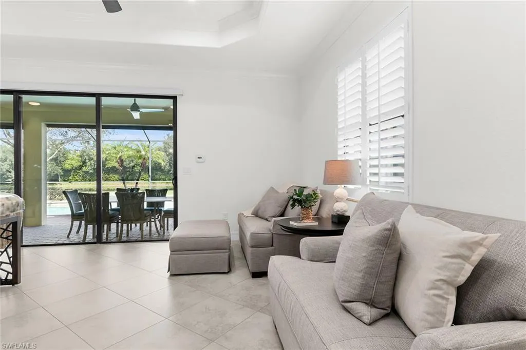 This open floor plan is light and bright with 2 bedrooms plus a spacious den, 2 full baths and a pool bathroom. This home features a generator, impact glass, tile roof, tankless hot water heater, plantation shutters, crown molding, large tile on the diagonal. The master bath is luxurious with a walk-in shower, soaker tub and water closet. The oversized brick paver lanai is very private and includes an outdoor kitchen, gas heated pool and spa, pool bath and covered space protected by electric storm screens. There is plenty of uncovered space for sunning, overlooking the large lake. A life of luxury is ensured in this residence enhanced by a beautiful 54,000-square-foot club and spa, full-service spa, fitness center complete with personal trainers and fitness classes, three swimming pools, championship golf courses, bocce, and 6 tennis courts and 10 pickleball courts with competitive teams. Fiddler’s Creek is close to Marco Island Executive Airport, beaches, shopping, restaurants, boating and easy access to Naples 5th Avenue.
