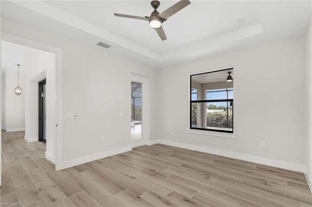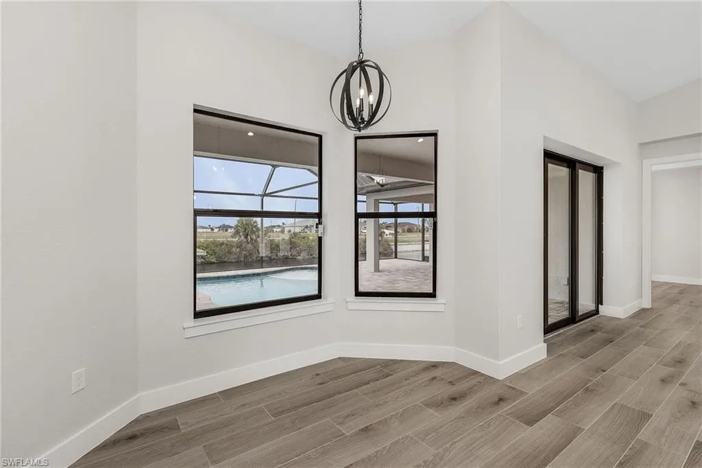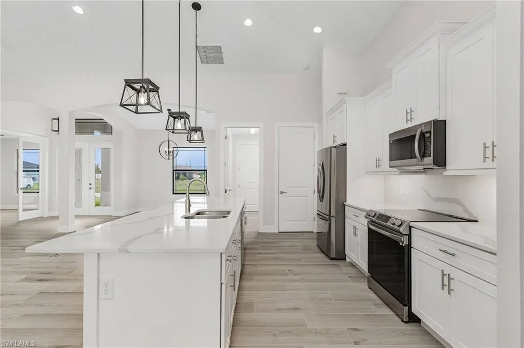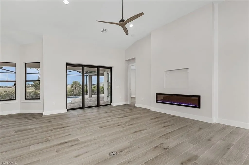 Enjoy the Florida lifestyle in this stunning new construction pool home located in desirable SW Cape Coral. Ready for occupancy. This 4 bedroom+Den/3 bath modern style floor plan will surely impress. Double glass door entryway, foyer opens up to the large living room with vaulted ceilings, dining area and separate den/game room, plenty of room for entertaining. The kitchen is a dream featuring solid wood cabinetry with crown moulding, soft close hardware, Calacatta Quartz counters and stainless steel appliances. Tray ceilings in all bedrooms. 8′ doors throughout. Other high end features such as 9″x47″ porcelain plank tile flooring throughout entire home. Calacatta Quartz counters in baths and laundry room, 5” baseboard throughout, all impact windows, doors and slider, tray ceilings in all bedrooms and den. Split floor plan featuring three large guest bedrooms, master bedroom suite with two generous size walk in closets and well appointed master bath with free standing tub, spacious shower and double vanity. 13’x26′ pool facing west for those beautiful sunsets and upgraded “clear view” screen enclosure. PGT impact resistant windows, door, slider. Oversized lot 85’x125′. Connected to city water, sewer and irrigation
