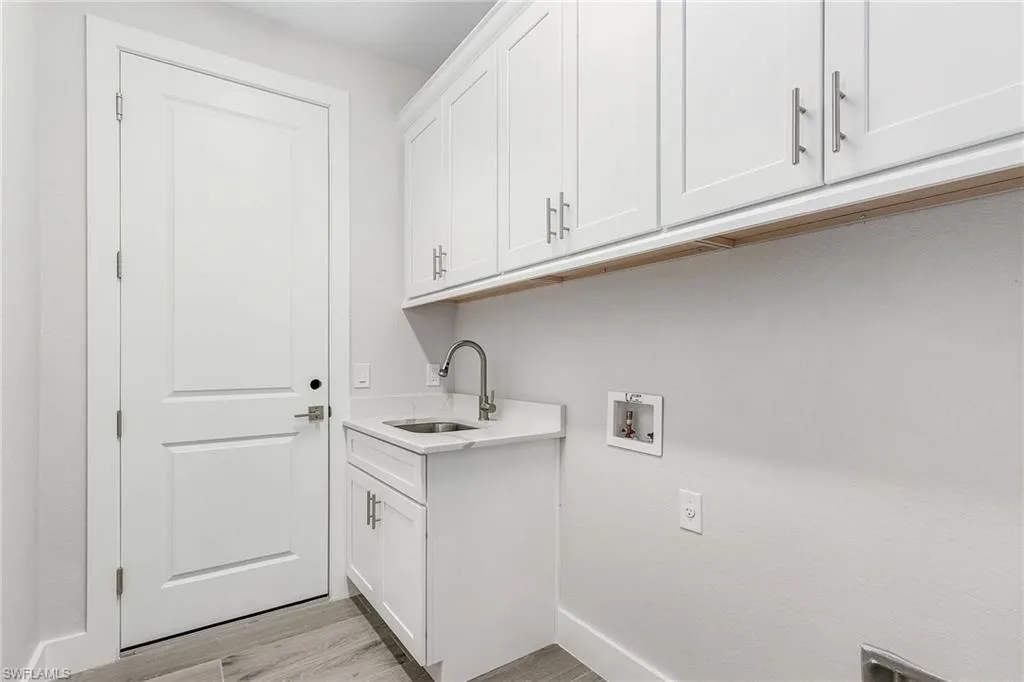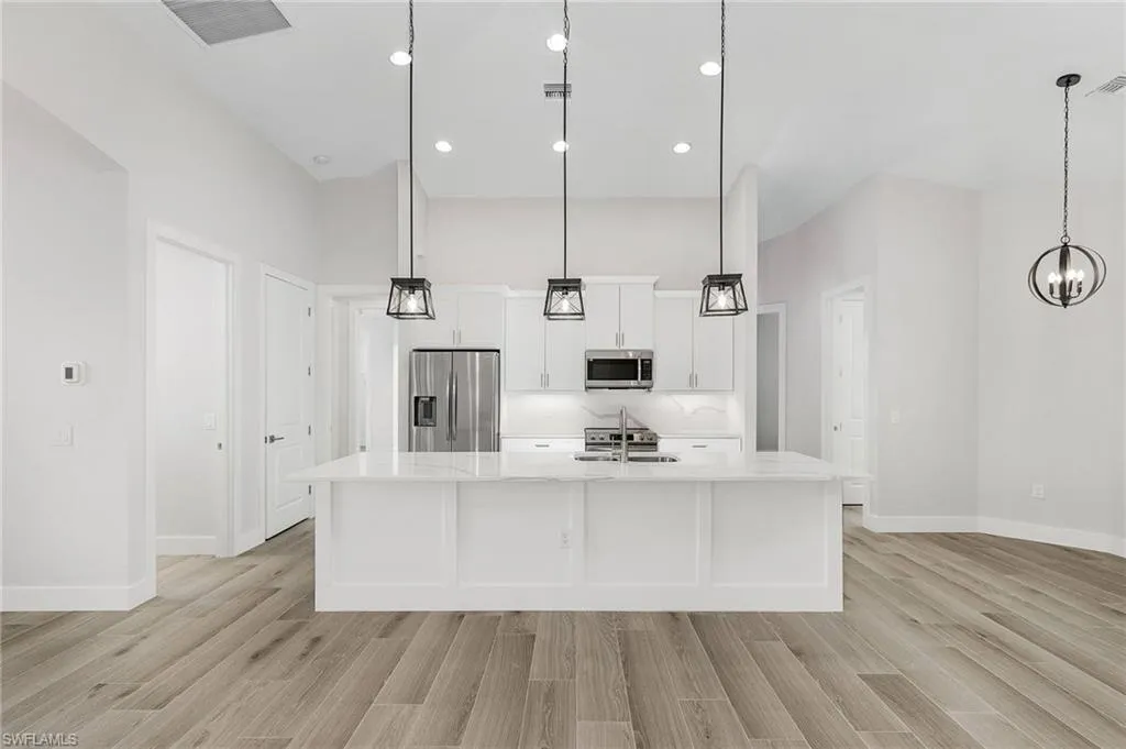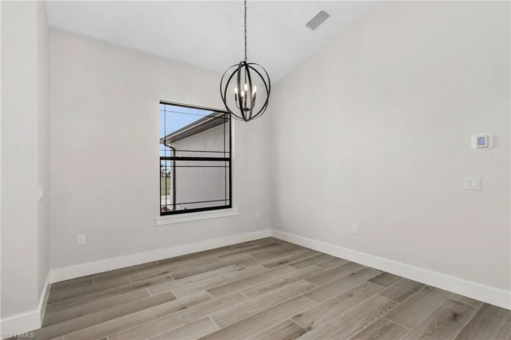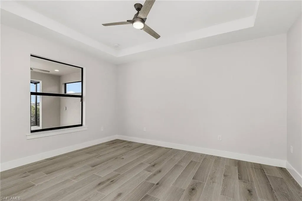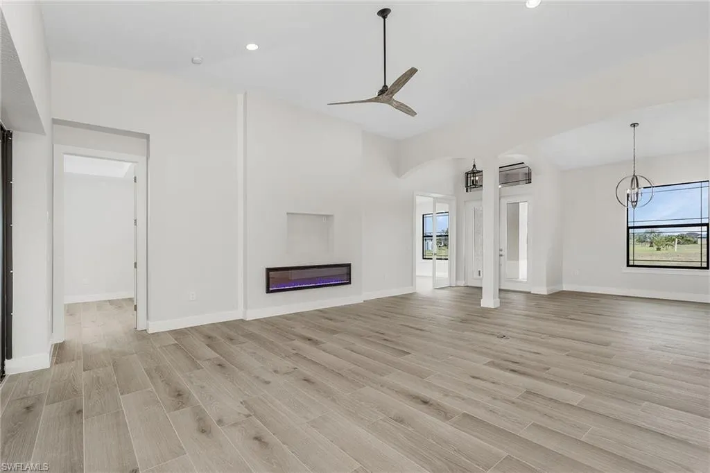 Enjoy the Florida lifestyle in this stunning new construction pool home located in desirable SW Cape Coral. Ready for occupancy. This 4 bedroom+Den/3 bath modern style floor plan will surely impress. Double glass door entryway, foyer opens up to the large living room with vaulted ceilings, dining area and separate den/game room, plenty of room for entertaining. The kitchen is a dream featuring solid wood cabinetry with crown moulding, soft close hardware, Calacatta Quartz counters and stainless steel appliances. Tray ceilings in all bedrooms. 8′ doors throughout. Other high end features such as 9″x47″ porcelain plank tile flooring throughout entire home. Calacatta Quartz counters in baths and laundry room, 5” baseboard throughout, all impact windows, doors and slider, tray ceilings in all bedrooms and den. Split floor plan featuring three large guest bedrooms, master bedroom suite with two generous size walk in closets and well appointed master bath with free standing tub, spacious shower and double vanity. 13’x26′ pool facing west for those beautiful sunsets and upgraded “clear view” screen enclosure. PGT impact resistant windows, door, slider. Oversized lot 85’x125′. Connected to city water, sewer and irrigation