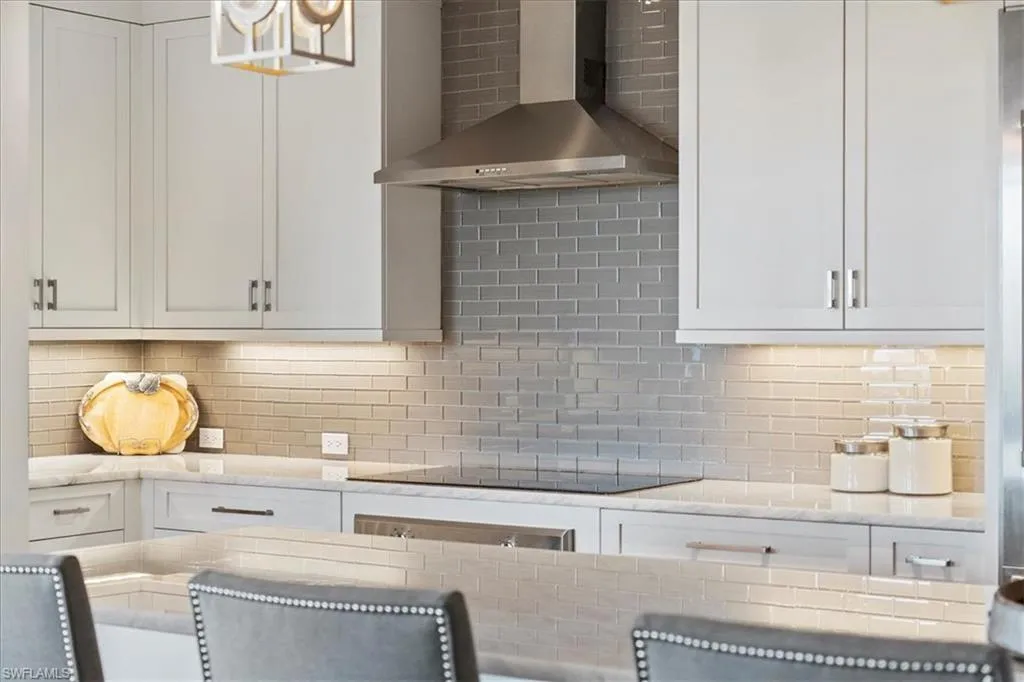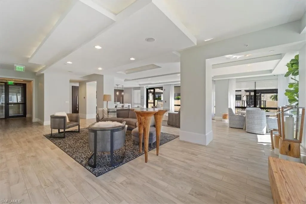 Welcome to the epitome of elegant living at the exquisite top-floor residence in Naples Square. This remarkable home invites you to experience the best of downtown Naples living with its spacious 2,264 square feet of sophisticated design. Step inside to discover an open great-room layout that offers high ceilings and abundant natural light, creating an inviting and airy ambiance. Beautiful hardwood flooring flows throughout the residence. The gourmet kitchen is a chef’s dream, featuring custom cabinetry, a built in pantry, sleek quartz countertops, a large island perfect for entertaining, and premium stainless-steel appliances that cater to your culinary desires. Additional highlights include a custom wet bar, exclusive to this residence. Retreat to the primary suite, featuring a charming Juliette balcony. Here, you’ll find a spa-like bath and private balcony access, offering a serene escape at the end of the day. The expansive lanai is an ideal spot to enjoy breathtaking sunsets and panoramic city views, adding a touch of magic to your evenings. Naples Square is renowned for its resort-style amenities, including a courtyard pool and spa, a state-of-the-art fitness center, a fire pit lounge, and a stylish club room. Secure garage parking and additional storage are also included for your convenience. Ideally located just steps from 5th Avenue South, Tin City, Bayfront, Baker Park, and the pristine beaches of Naples, this residence offers a lifestyle of luxury and ease. Embrace the vibrant downtown energy or relax in your secluded retreat—this home offers the best of both worlds.