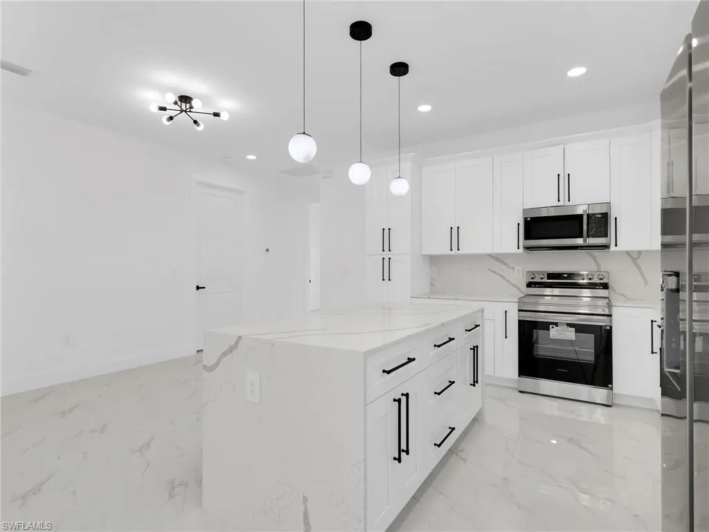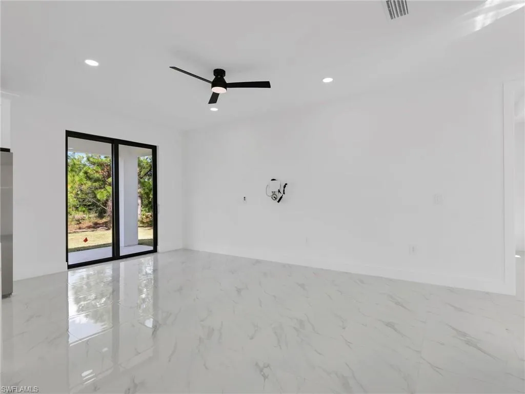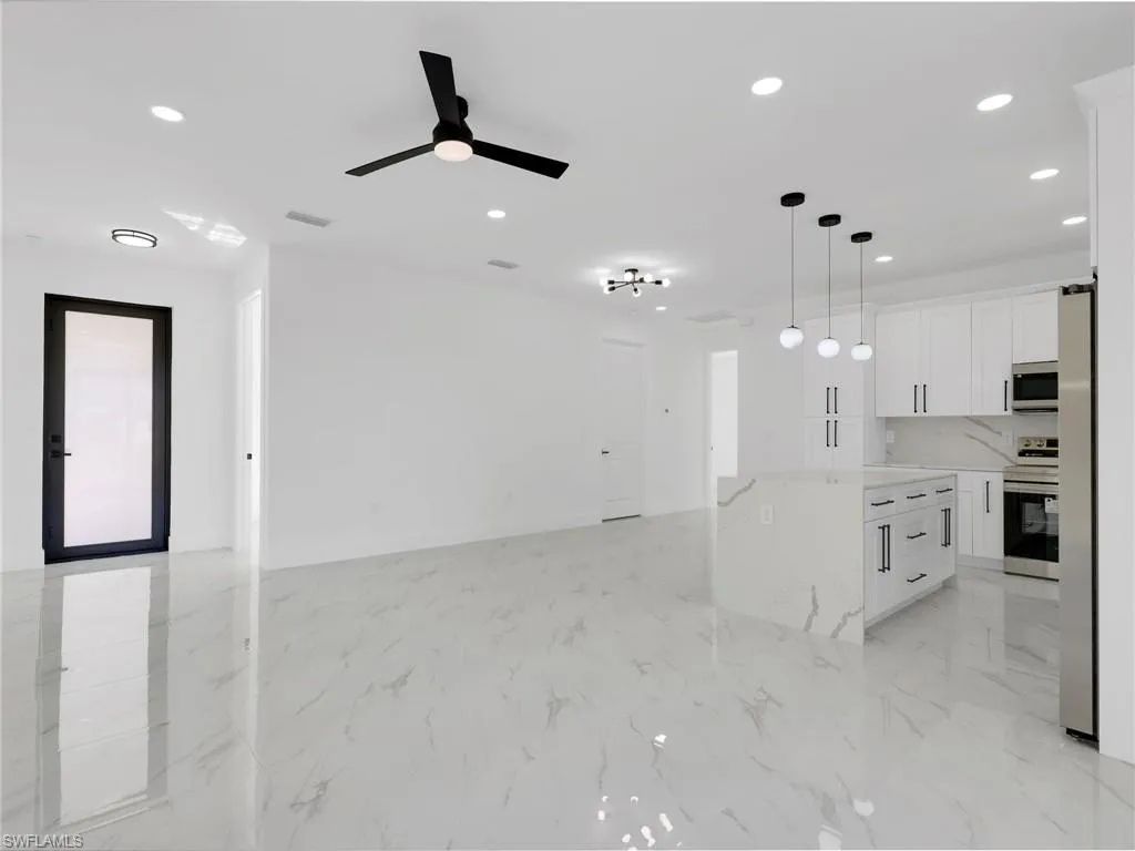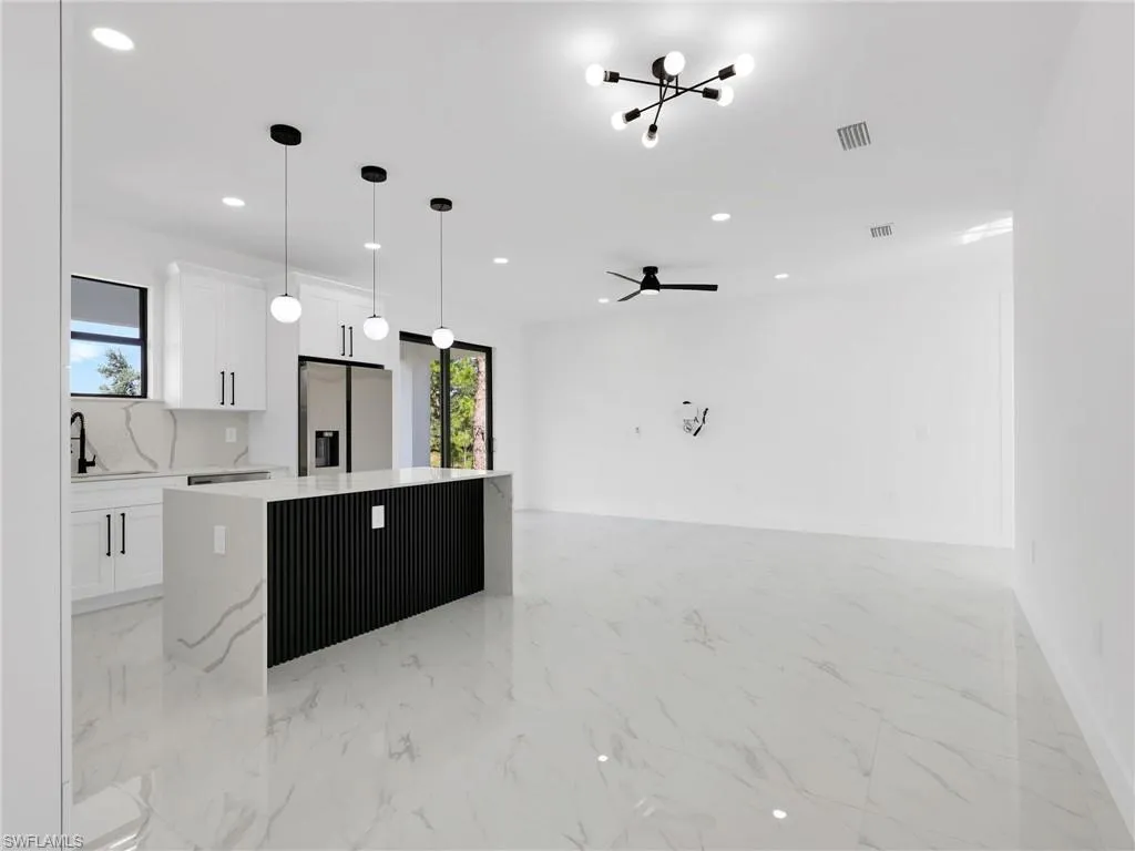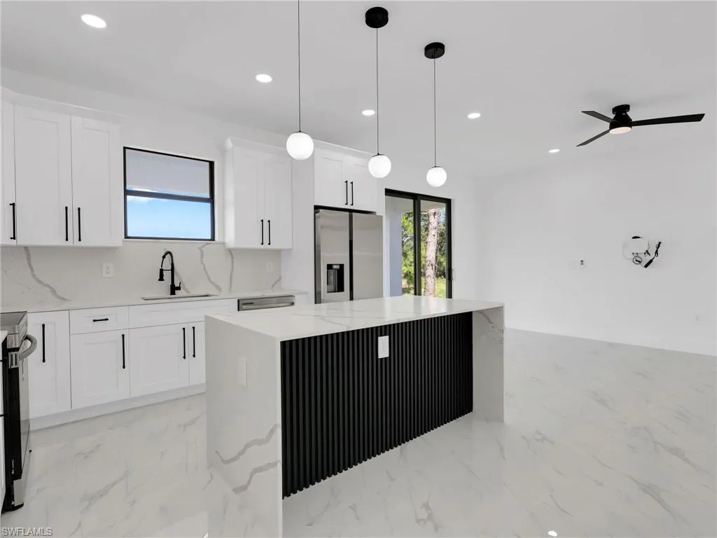 This NEW CONSTRUCTION HOME combines MODERN STYLE, PREMIUM FINISHES, and a SMART LAYOUT that truly stands out. It features 4 BEDROOMS and 2 FULL BATHROOMS with TILE FLOORING THROUGHOUT, offering both ELEGANCE and DURABILITY. The MODERN LIVING ROOM showcases UNIQUE DESIGN DETAILS rarely found at this price point. The SPACIOUS KITCHEN includes a STUNNING WATERFALL ISLAND, QUARTZ COUNTERTOPS, STAINLESS STEEL APPLIANCES, and PREMIUM FINISHES. Enjoy IMPACT-RESISTANT WINDOWS AND DOORS for SAFETY and ENERGY EFFICIENCY. The LAUNDRY ROOM is FULLY EQUIPPED with COUNTER SPACE, CABINETS, SINK, WASHER, and DRYER INCLUDED. Step outside to a LARGE COVERED LANAI with EXTERIOR COUNTER, perfect for RELAXING or ENTERTAINING. The 2-CAR GARAGE features EPOXY FLOORING for STYLE and DURABILITY. Additional upgrades include PENDANT LIGHTS, CEILING FANS, LED LIGHTING, STYLISH BATHROOM MIRRORS AND FIXTURES, and a SECURITY CAMERA SYSTEM. Located in a TOP LEHIGH ACRES ZIP CODE, just 17 MILES FROM FORT MYERS INTERNATIONAL AIRPORT, this home offers CONVENIENCE, QUALITY, and MODERN LIVING. HELP WITH CLOSING COSTS AVAILABLE.