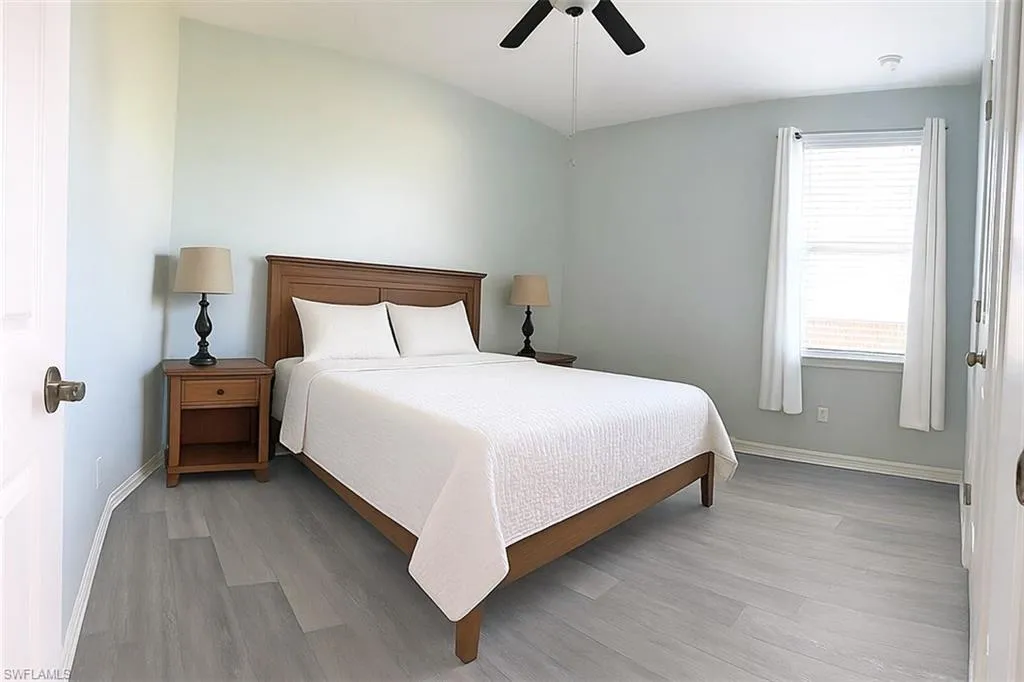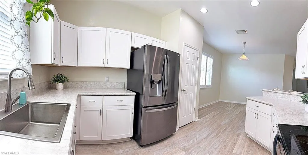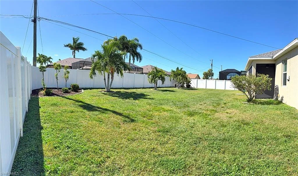 (One or more photos were virtually staged) Welcome to this amazing Tortuga LGI Home in the Southwest Cape! The home is NOT located in a flood zone! This home is better than new with all its additional upgrades. You will love this exclusive floor plan including 3 bedrooms, 2 full bathrooms, a large kitchen with dining area, spacious living area, and screened lanai. The kitchen features LG stainless steel appliances (2024), plenty of new white cabinets (2025) for storage, pantry, new countertops (2025), undermount kitchen sink, breakfast bar and eat-in area. The master bedroom is very spacious with the master bathroom having a separate walk-in shower, garden tub, and a huge walk-in closet. The split bedroom plan is perfect for a large family or guests. You have two additional bedrooms with a full bathroom. The indoor laundry includes newer LG washer and dryer (2024). The back yard will be your private oasis including a large screened lanai for enjoying your outdoor meals, white privacy vinyl fence, and landscaping to set a serene setting. You can also conveniently store a boat/trailer inside the fenced yard and add a pool if you wish. The two car garage also includes storage units. Other upgrades: Roof (2022), Vinyl Flooring (2025) AC (2022), AC Handler (2021), Hot water heater (2025) Conveniently located to restaurants, shopping, medical facilities, and schools. City Sewer and Water Assessments will be PAID IN FULL at closing with an acceptable offer!